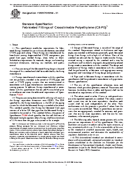 1.3 Fittings manufactured in accordance with this specification are primarily intended to be joined to CX-PE pipes and used in CX-PE piping systems that are commissioned in accordance with a pipe manufacturer recommended commissioning practice. In addition, fittings manufactured in accordance with this specification that are =65 % crosslinked prior to installation can meet the additional requirements of Specification F2829.