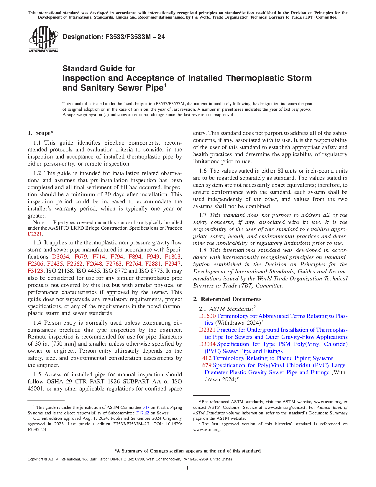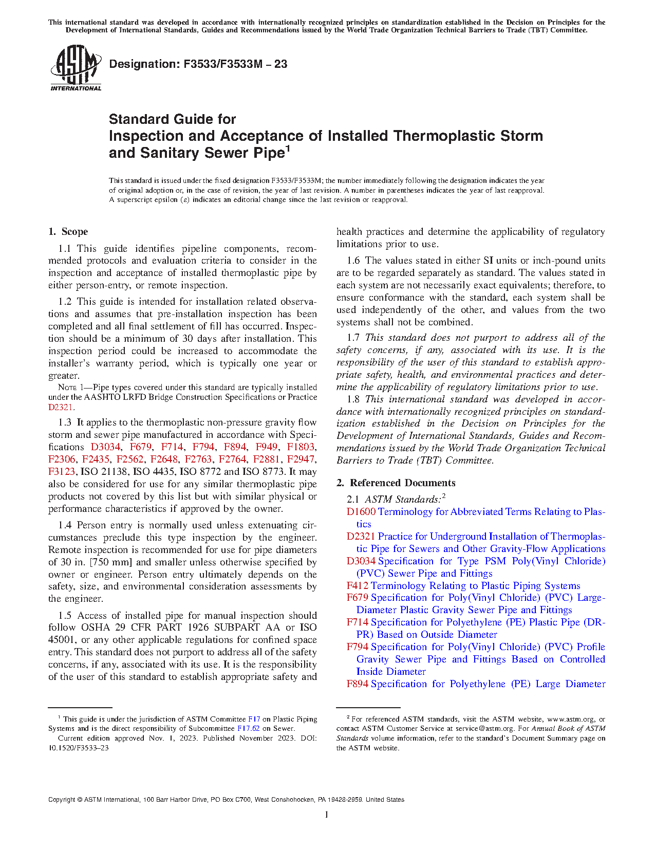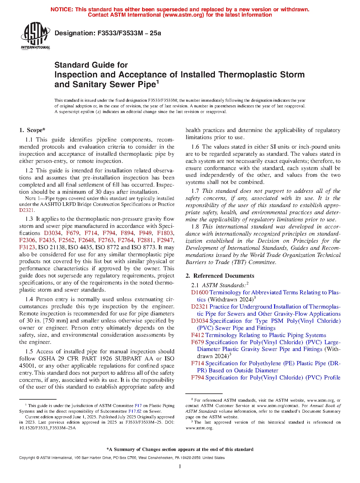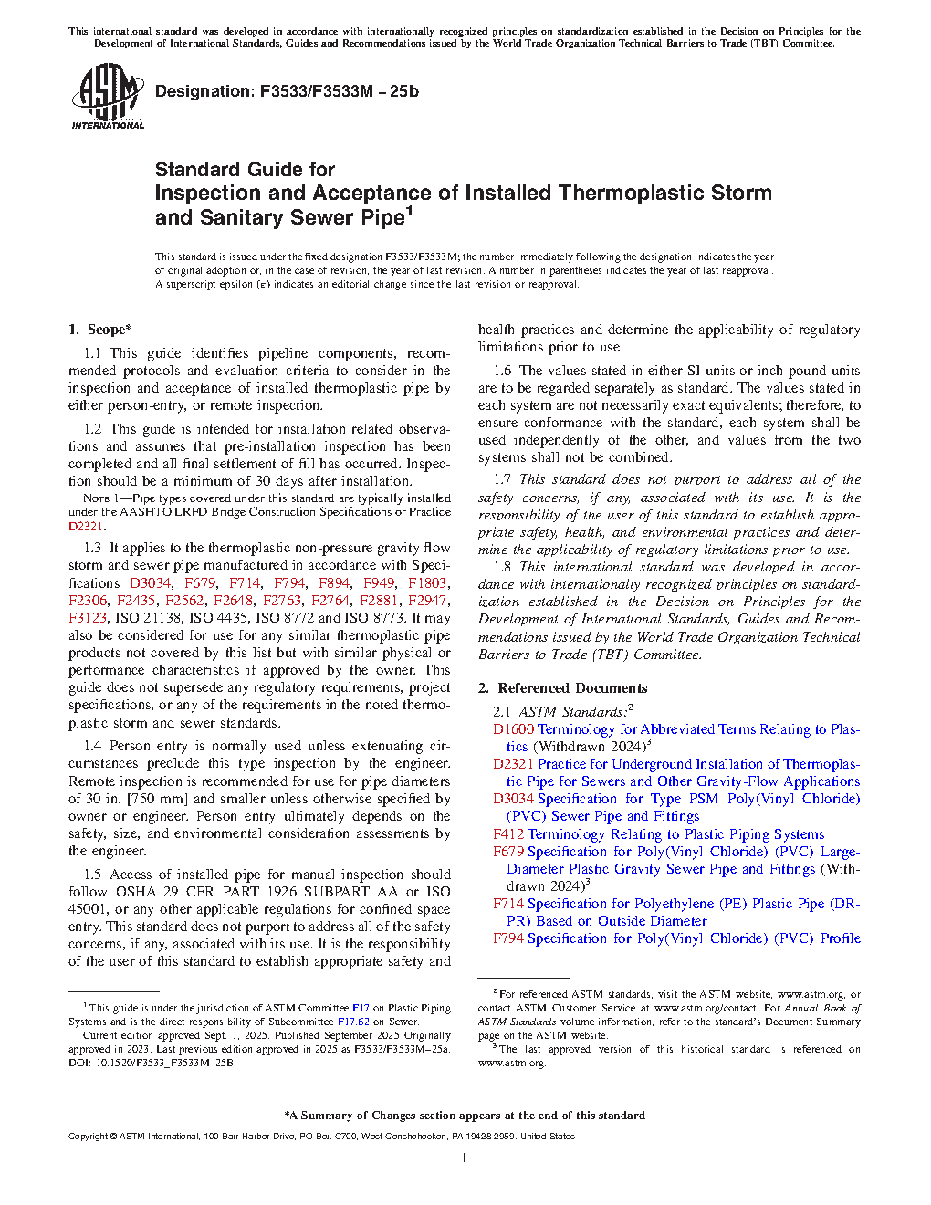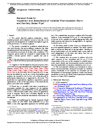 1.3 It applies to the thermoplastic non-pressure gravity flow storm and sewer pipe manufactured in accordance with Specifications D3034, F679, F714, F794, F894, F949, F1803, F2306, F2435, F2562, F2648, F2763, F2764, F2881, F2947, F3123, ISO 21138, ISO 4435, ISO 8772 and ISO 8773. It may also be considered for use for any similar thermoplastic pipe products not covered by this list but with similar physical or performance characteristics if approved by the owner. This guide does not supersede any regulatory requirements, project specifications, or any of the requirements in the noted thermoplastic storm and sewer standards.
