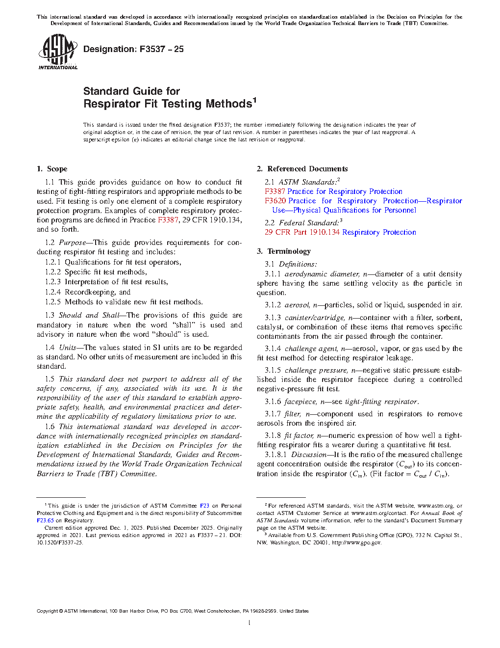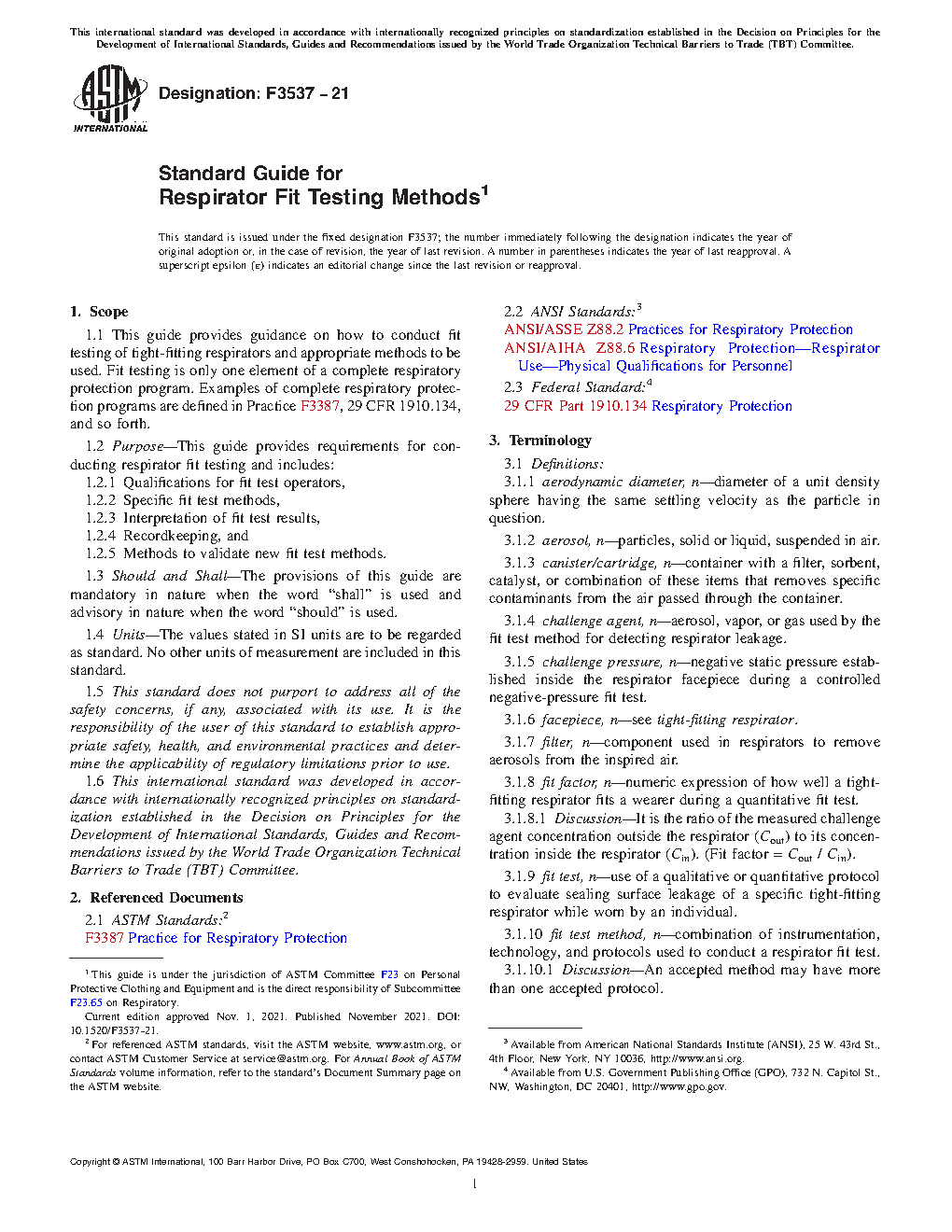 1.1 This guide provides guidance on how to conduct fit testing of tight-fitting respirators and appropriate methods to be used. Fit testing is only one element of a complete respiratory protection program. Examples of complete respiratory protection programs are defined in Practice F3387, 29 CFR 1910.134, and so forth.