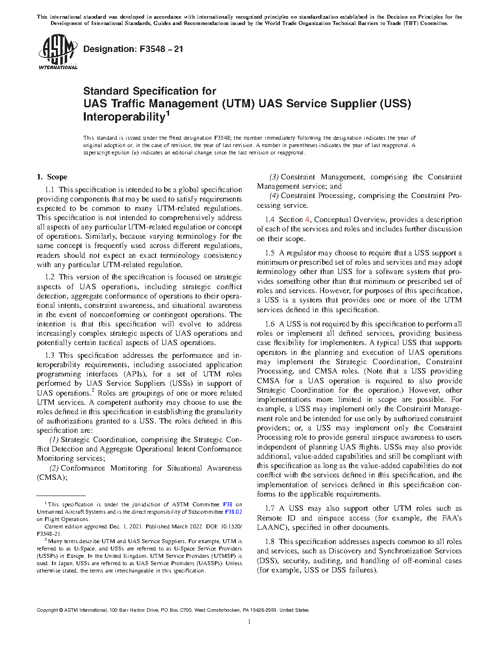 1.3 This specification addresses the performance and interoperability requirements, including associated application programming interfaces (APIs), for a set of UTM roles performed by UAS Service Suppliers (USSs) in support of UAS operations.2 Roles are groupings of one or more related UTM services. A competent authority may choose to use the roles defined in this specification in establishing the granularity of authorizations granted to a USS. The roles defined in this specification are: