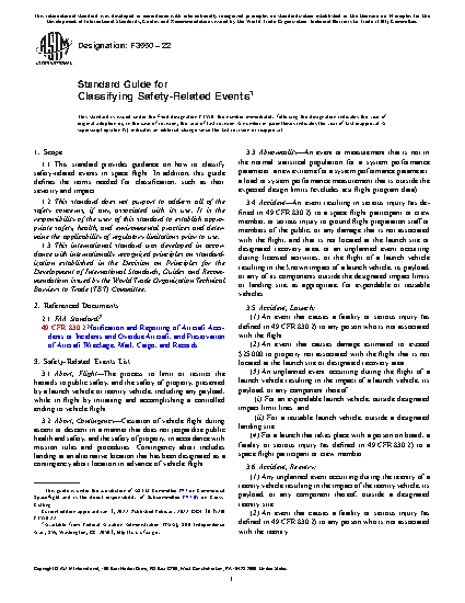 1.1 This standard provides guidance on how to classify safety-related events in space flight. In addition, this guide defines the terms needed for classification, such as their severity and impact.