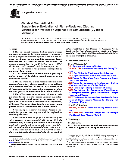 1.1 This test method measures the heat transfer through flame-resistant materials for clothing mounted on a stationary, vertically aligned instrumented cylinder which are then exposed in a laboratory to a simulated fire environment having controlled heat flux, flame distribution, and duration. The average exposure heat flux is 84 kW/m2 ± 2.1 kW/m2 (2 cal/s·cm2 ± 0.05 cal/s·cm2), with durations up to 20 s.