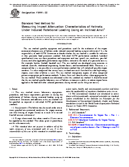 1.1 This test method covers laboratory equipment, procedures, and basic requirements pertinent to testing the performance of helmets during rotational loading using an incline anvil. Deviations and additions to this test method will be specified, as required, in individual ASTM performance standards.