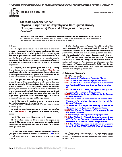 1.2 Polyethylene corrugated pipe and fittings, being thermoplastic, are re-processable and recyclable (Note 2). This specification allows for the manufacture of these products with recycled polyethylene content, provided the minimum performance requirements of this specification are met.
