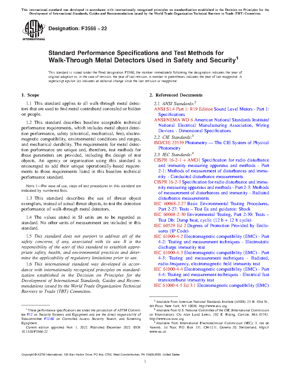 1.2 This standard describes baseline acceptable technical performance requirements, which includes metal object detection performance, safety (electrical, mechanical, fire), electromagnetic compatibility, environmental conditions and ranges, and mechanical durability. The requirements for metal detection performance are unique and, therefore, test methods for these parameters are provided, including the design of test objects. An agency or organization using this standard is encouraged to add their unique operationally-based requirements to those requirements listed in this baseline technical performance standard.