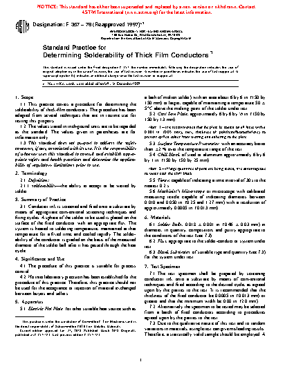 1.1 This practice covers a procedure for determining the solderability of thick-film conductors. The procedure has been adapted from several techniques that are in routine use for testing this property.