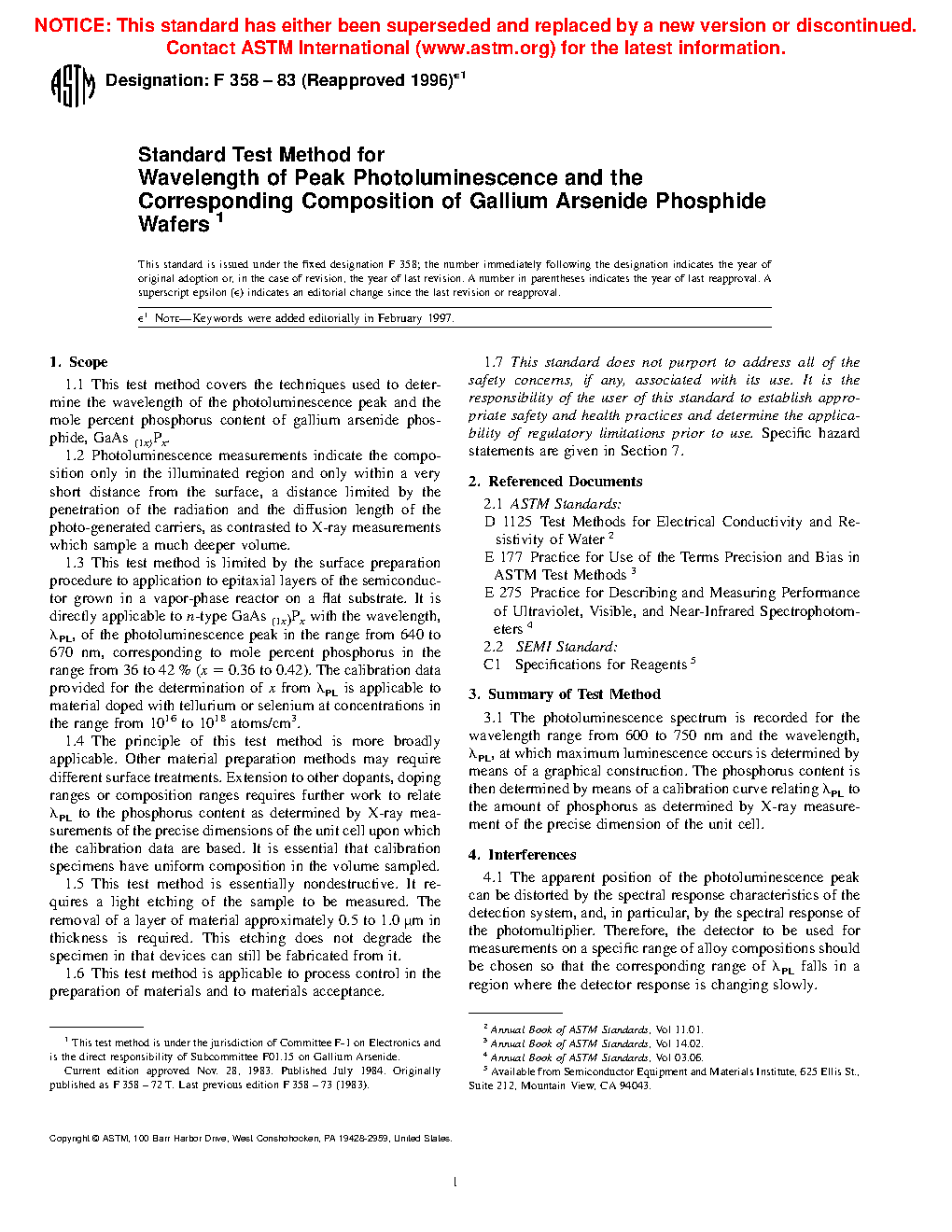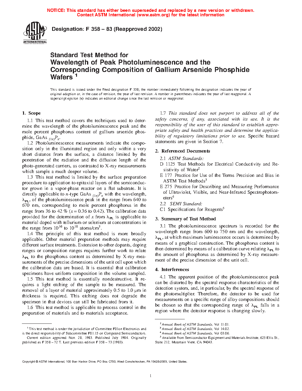 1.1 This test method covers the techniques used to determine the wavelength of the photoluminescence peak and the mole percent phosphorus content of gallium arsenide phosphide, GaAs(1 x)Px.