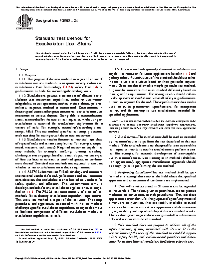 1.2 Exoskeleton—The exoskeleton shall be used as intended by the manufacturer to perform the test described in this test method. If the exoskeleton is not designed for stair use and the test requestor intends to use the exoskeleton to perform a stair test (for example, for research, development of stair-capable use by a manufacturer, stair training as in medical rehabilitation applications), appropriate manufacturer approvals should be sought prior to performing the test method.