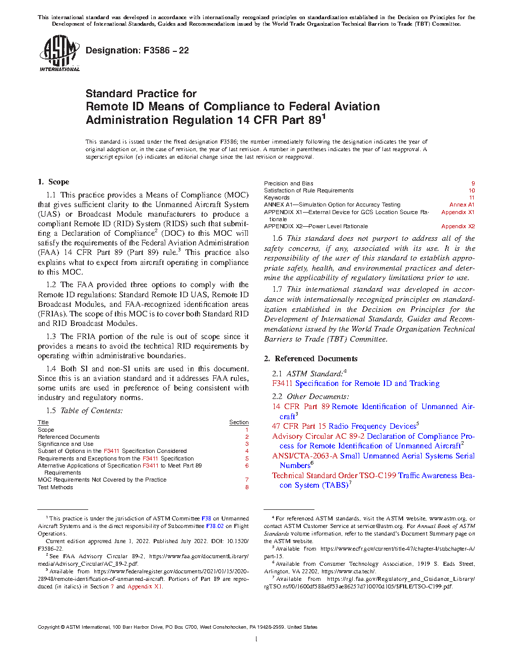 1.1 This practice provides a Means of Compliance (MOC) that gives sufficient clarity to the Unmanned Aircraft System (UAS) or Broadcast Module manufacturers to produce a compliant Remote ID (RID) System (RIDS) such that submitting a Declaration of Compliance2 (DOC) to this MOC will satisfy the requirements of the Federal Aviation Administration (FAA) 14 CFR Part 89 (Part 89) rule.3 This practice also explains what to expect from aircraft operating in compliance to this MOC.