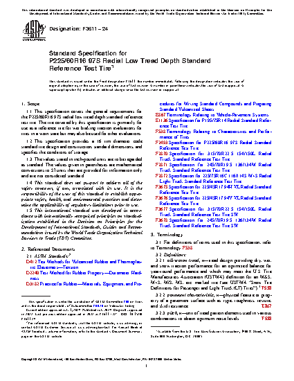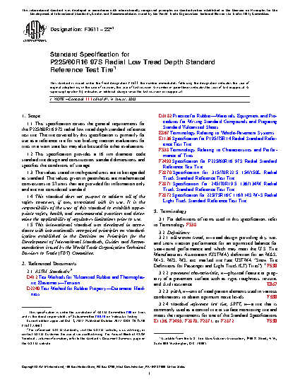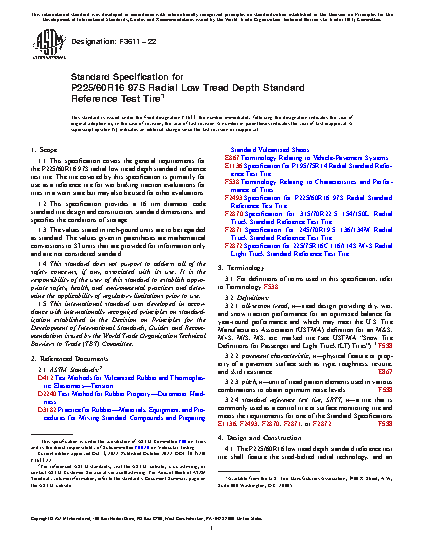 1.1 This specification covers the general requirements for the P225/60R16 97S radial low tread depth standard reference test tire. The tire covered by this specification is primarily for use as a reference tire for wet braking traction evaluations for tires in a worn state but may also be used for other evaluations.
