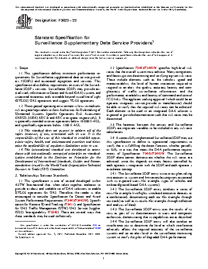 1.1 This specification defines minimum performance requirements for Surveillance supplemental data service providers (SDSPs) and associated equipment and services. This specification also defines requirements on users of the Surveillance SDSP’s services. Surveillance SDSPs may provide aircraft track information to Detect and Avoid (DAA) systems and situational awareness tools to enable beyond visual line of sight (BVLOS) UAS operations and support VLOS operations.