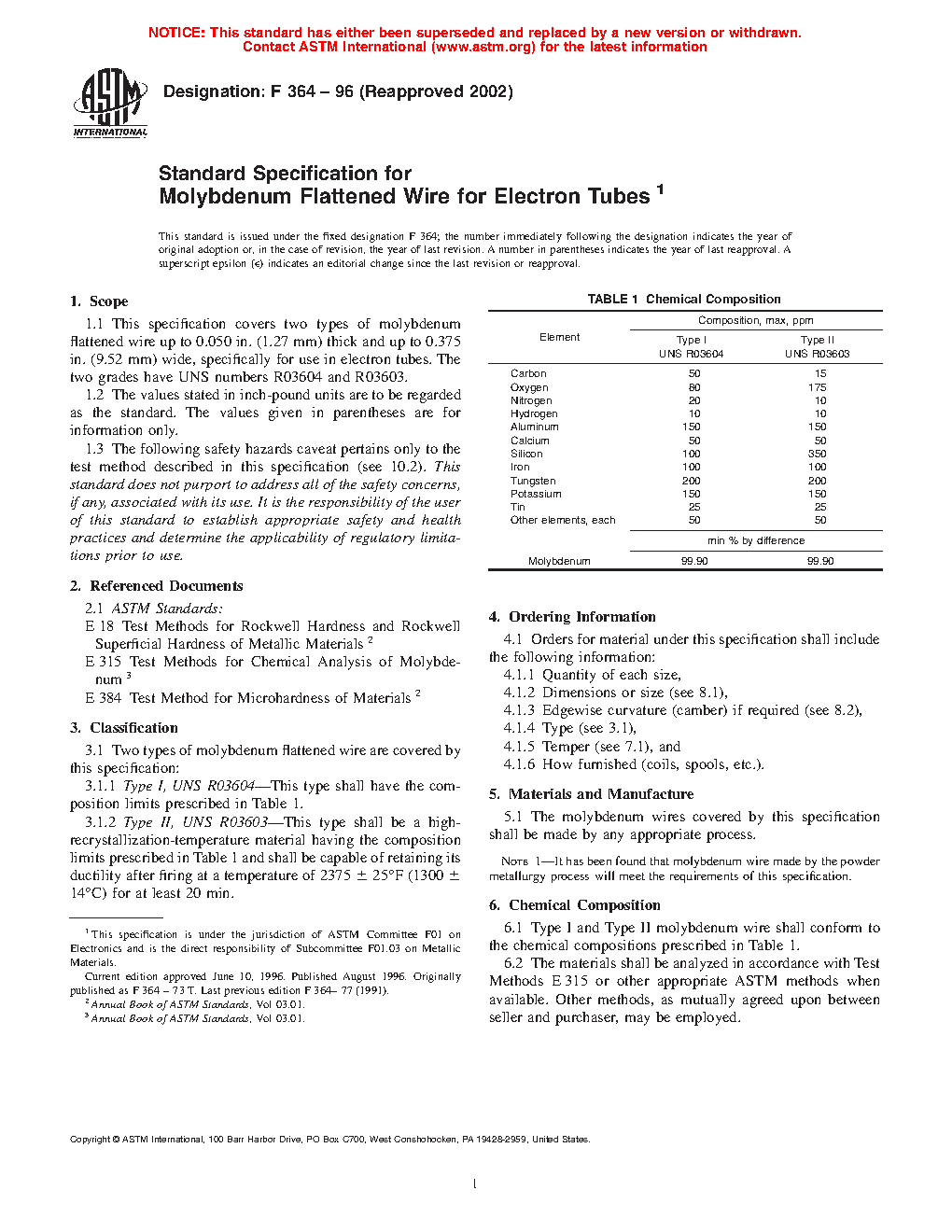 1.1 This specification covers two types of molybdenum flattened wire up to 0.050 in. (1.27 mm) thick and up to 0.375 in. (9.52 mm) wide, specifically for use in electron tubes. The two grades have UNS numbers R03604 and R03603.
