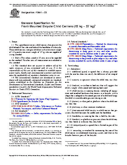 1.1 This specification covers child carriers that position the child ahead of the rider and behind the handlebar of a bicycle. These child carriers transport children with a minimum weight of 12 kg and a maximum weight of 27 kg who are capable of sitting unaided.