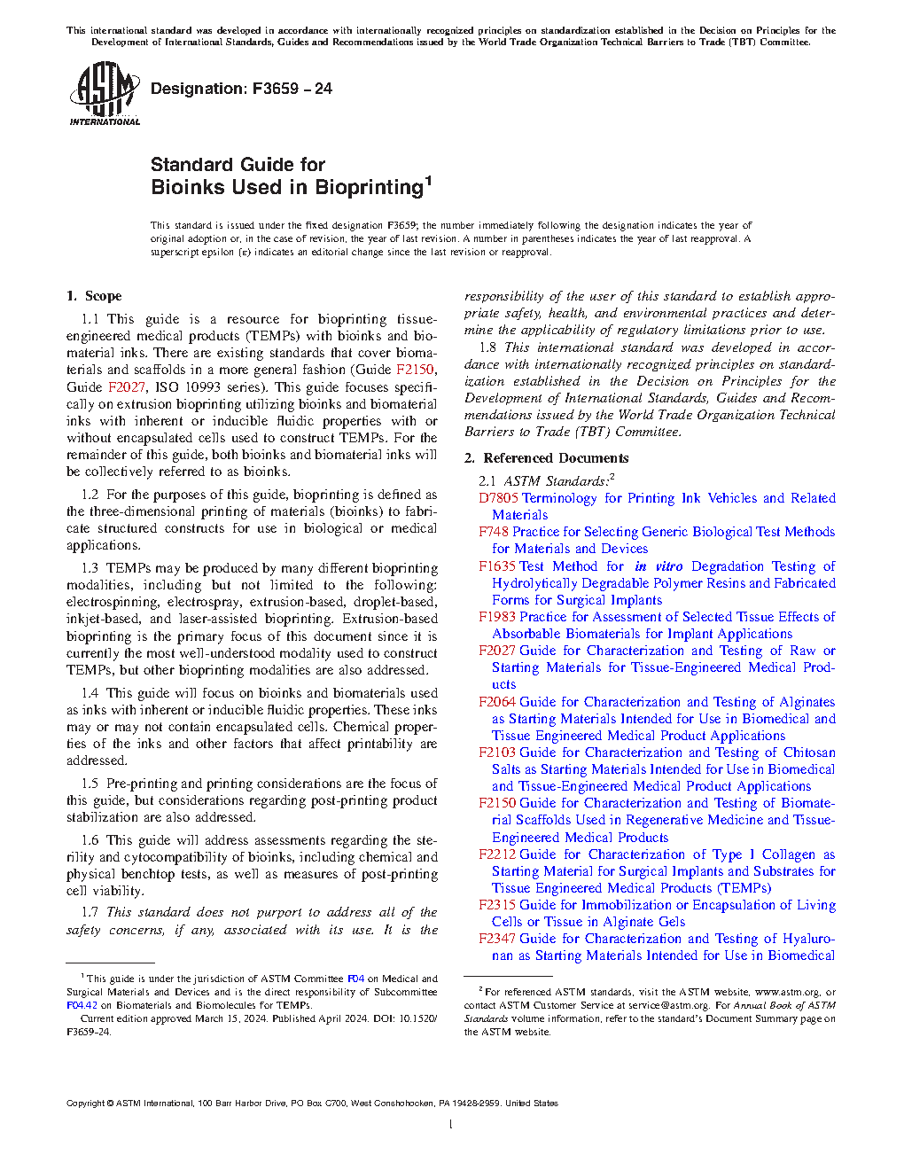 1.1 This guide is a resource for bioprinting tissue-engineered medical products (TEMPs) with bioinks and biomaterial inks. There are existing standards that cover biomaterials and scaffolds in a more general fashion (Guide F2150, Guide F2027, ISO 10993 series). This guide focuses specifically on extrusion bioprinting utilizing bioinks and biomaterial inks with inherent or inducible fluidic properties with or without encapsulated cells used to construct TEMPs. For the remainder of this guide, both bioinks and biomaterial inks will be collectively referred to as bioinks.