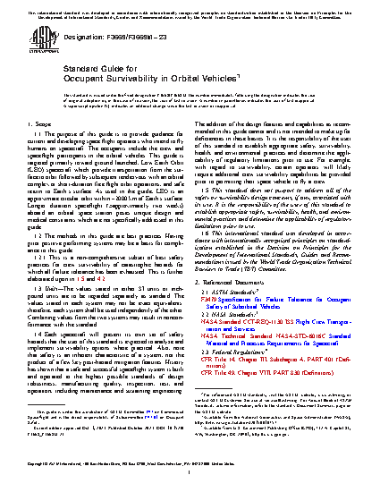 1.1 The purpose of this guide is to provide guidance for current and developing space flight operators who intend to fly humans on spacecraft. The occupants include the crew and spaceflight participants in the orbital vehicles. This guide is targeted primarily toward ground launched, Low Earth Orbit (LEO) spacecraft which provide transportation from the surface to orbit followed by subsequent rendezvous with an orbital complex or short-duration free flight orbit operations, and safe return to Earth’s surface. As used in the guide, LEO is an approximate circular orbit within ~2000 km of Earth’s surface. Longer duration spaceflight (>approximately two weeks) aboard an orbital space station poses unique design and medical constraints which are not specifically addressed in this guide.