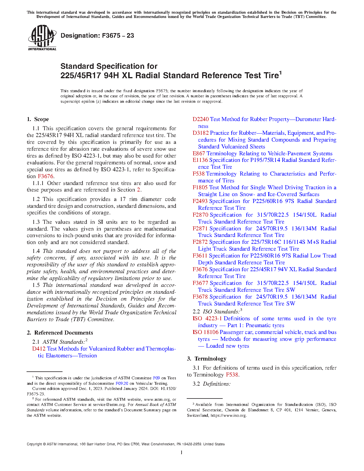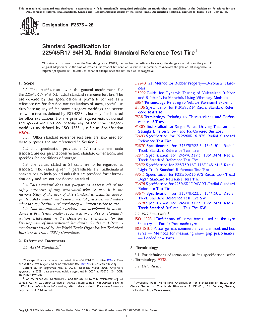 1.1 This specification covers the general requirements for the 225/45R17 94H XL radial standard reference test tire. The tire covered by this specification is primarily for use as a reference tire for abrasion rate evaluations of severe snow use tires as defined by ISO 4223-1, but may also be used for other evaluations. For the general requirements of normal, snow and special use tires as defined by ISO 4223-1, refer to Specification F3676.