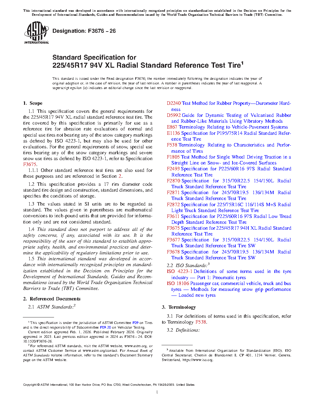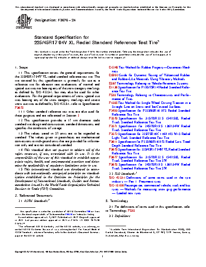 1.1Â This specification covers the general requirements for the 225/45R17 94V XL radial standard reference test tire. The tire covered by this specification is primarily for use as a reference tire for abrasion rate evaluations of normal and special use tires not bearing any of the snow category markings as defined by ISO 4223-1, but may also be used for other evaluations. For the general requirements of snow, special use tires bearing any of the snow category markings and severe snow use tires as defined by ISO 4223-1, refer to Specification F3675.
