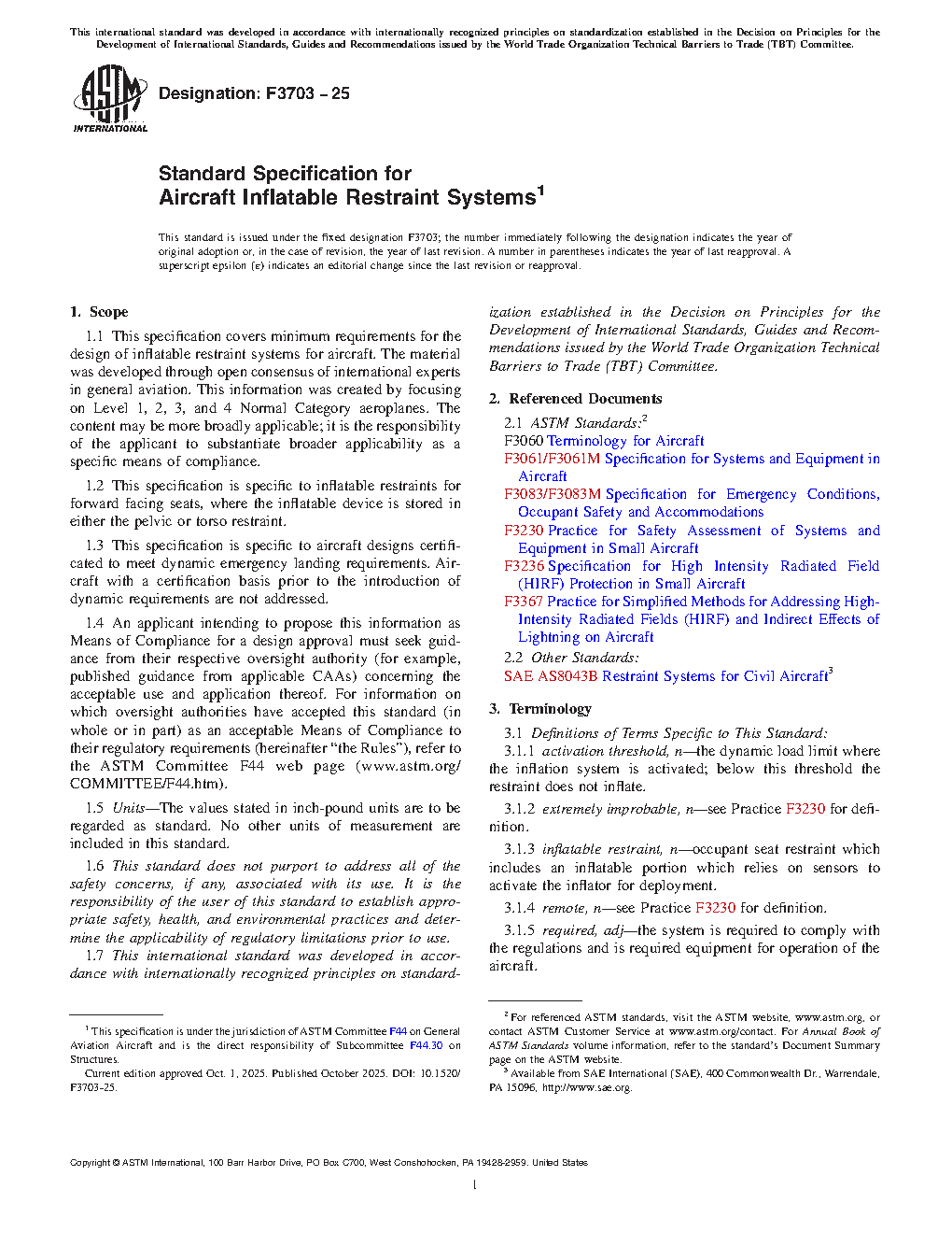 1.3 This specification is specific to aircraft designs certificated to meet dynamic emergency landing requirements. Aircraft with a certification basis prior to the introduction of dynamic requirements are not addressed.