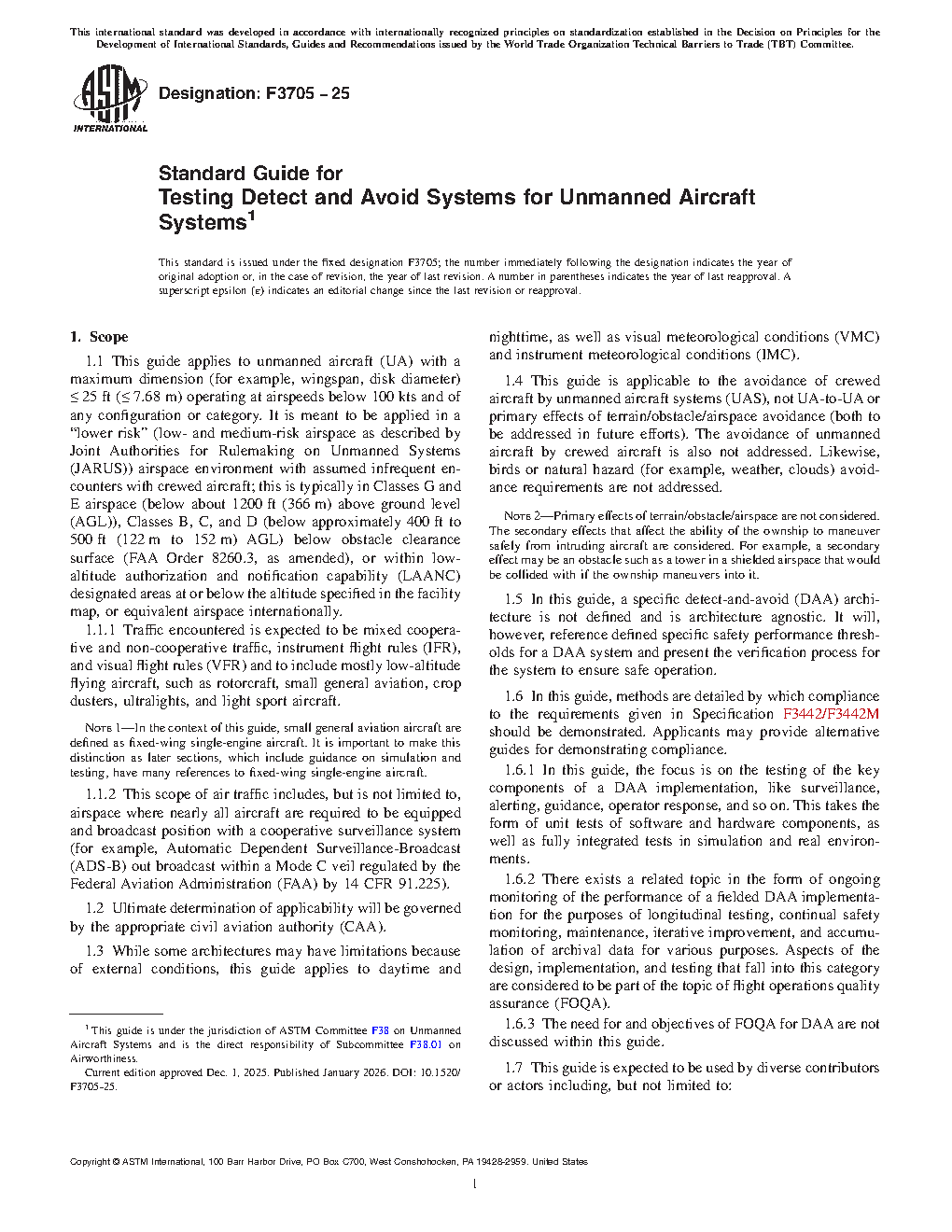 5.3 This guide exists to guide applicants toward a standardized methodology for validating their DAA system’s component functions and overall RRs. In this guide, a minimum set of procedures and considerations are defined for demonstrating that the applicant’s DAA system meets or exceeds the requirements of Specification F3442/F3442M. A standardized process for documenting the validation efforts is provided. Standardized reporting procedures ease the communication processes between applicants and the relevant regulator or authority and provide a common basis for documenting experimental results. In Section 13, considerations and report structure are provided while material in the appendixes give brief example reports for communicating compliance with Sections 8 – 12.