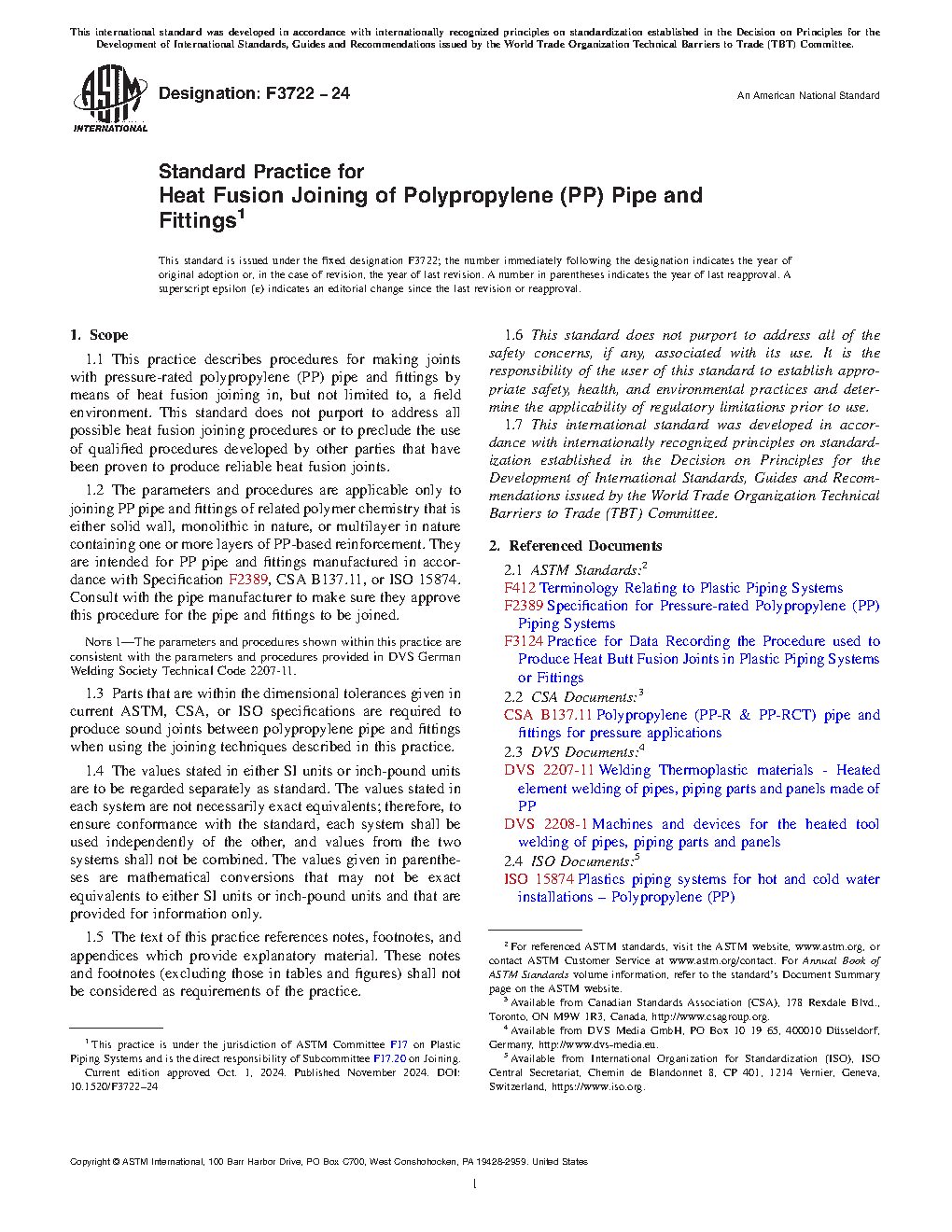 1.3 Parts that are within the dimensional tolerances given in current ASTM, CSA, or ISO specifications are required to produce sound joints between polypropylene pipe and fittings when using the joining techniques described in this practice.