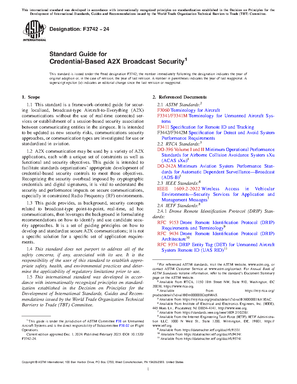 1.1 This standard is a framework-oriented guide for securing localized, broadcast-type Aircraft-to-Everything (A2X) communications without the use of real-time connected services or establishment of a session-based security association between communicating entities in the airspace. It is intended to be updated as new security risks, communications security approaches, or communication types are investigated for use or standardized in aviation.