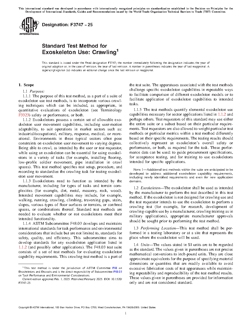 1.2 Exoskeleton—The exoskeleton shall be used as intended by the manufacturer to perform the test described in this test method. If the exoskeleton is not designed for crawling use and the test requestor intends to use the exoskeleton to perform a crawling test (for example, for research, development of crawling-capable use by a manufacturer, crawling training as in military applications), appropriate manufacturer approvals should be sought prior to performing the test method.