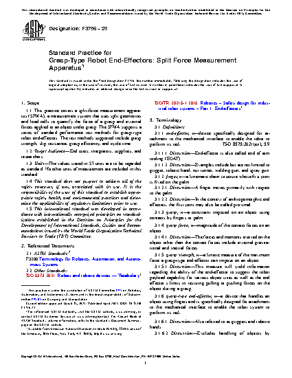 1.1Â This practice covers a split-force measurement apparatus (SFMA), a measurement system that uses split geometries and load cells to quantify the force of a grasp and external forces applied to an object under grasp. The SFMA supports a series of standard performance test methods for grasp-type robot end-effectors. The test methods supported include grasp strength, slip resistance, grasp efficiency, and cycle time.