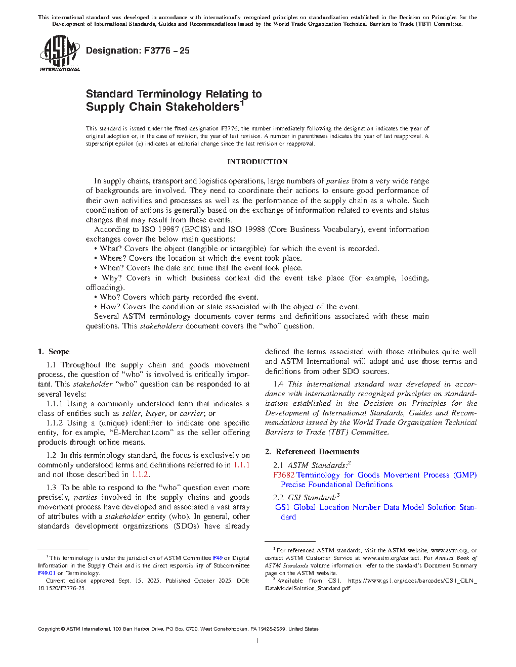 1.3 To be able to respond to the “who” question even more precisely, parties involved in the supply chains and goods movement process have developed and associated a vast array of attributes with a stakeholder entity (who). In general, other standards development organizations (SDOs) have already defined the terms associated with those attributes quite well and ASTM International will adopt and use those terms and definitions from other SDO sources.