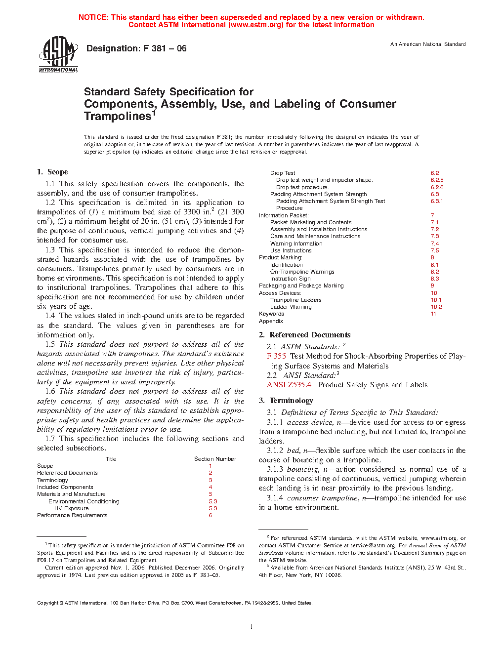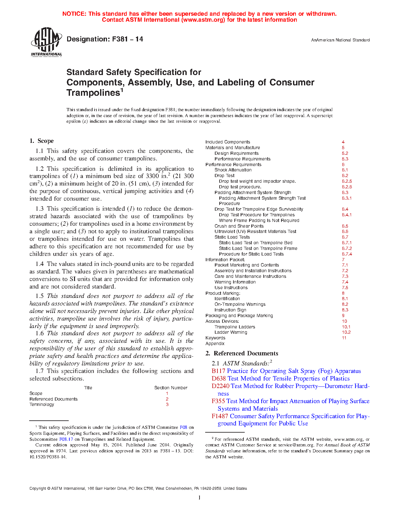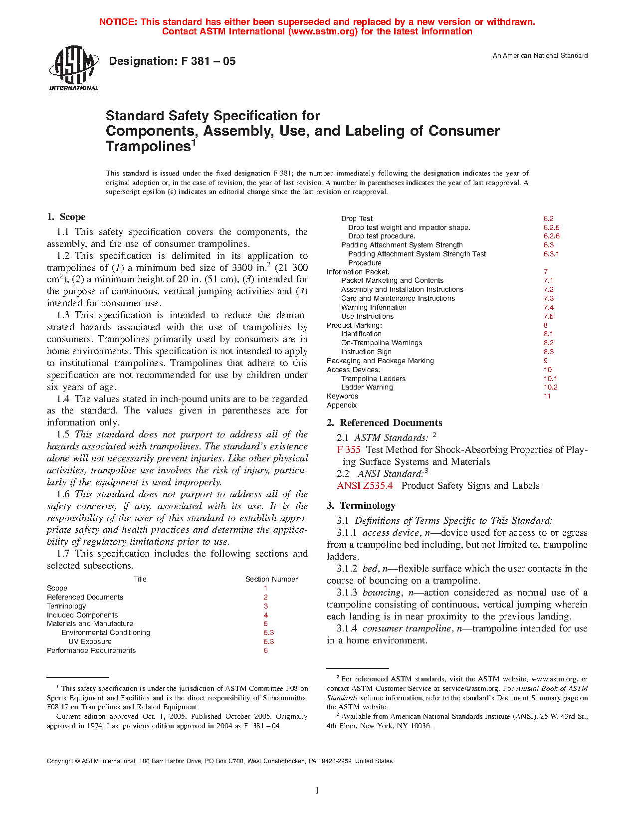 1.2 This specification is delimited in its application to trampolines of (1) a minimum bed size of 3300 in.2 (21 300 cm2), (2) a minimum height of 20 in. (51 cm), (3) intended for the purpose of continuous, vertical jumping activities and (4) intended for consumer use.