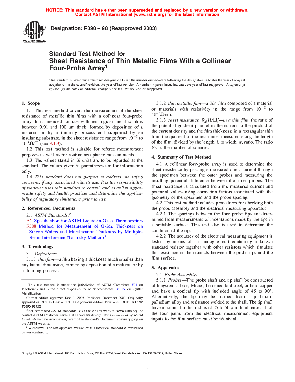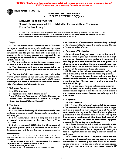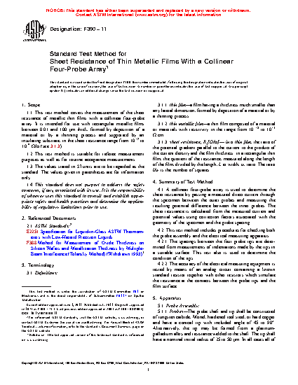 1.1 This test method covers the measurement of the sheet resistance of metallic thin films with a collinear four-probe array. It is intended for use with rectangular metallic films between 0.01 and 100 [mu]m thick, formed by deposition of a material or by a thinning process and supported by an insulating substrate, in the sheet resistance range from 10 to 10 [omega]/[open-box] (see 3.1.3).