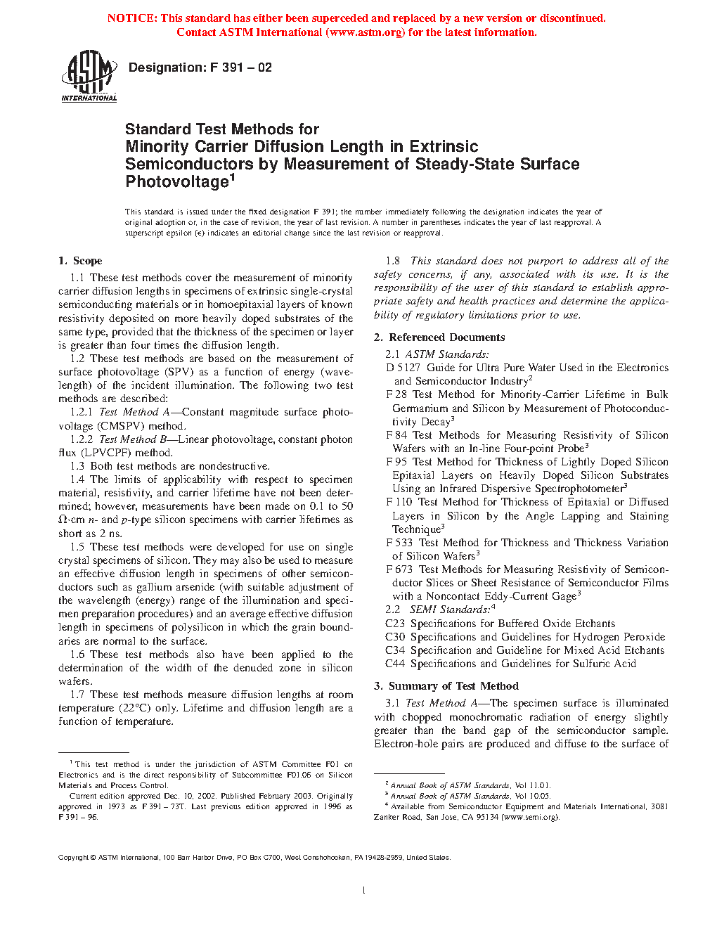 1.5 These test methods were developed for use on single crystal specimens of silicon. They may also be used to measure an effective diffusion length in specimens of other semiconductors such as gallium arsenide (with suitable adjustment of the wavelength (energy) range of the illumination and specimen preparation procedures) and an average effective diffusion length in specimens of polysilicon in which the grain boundaries are normal to the surface.