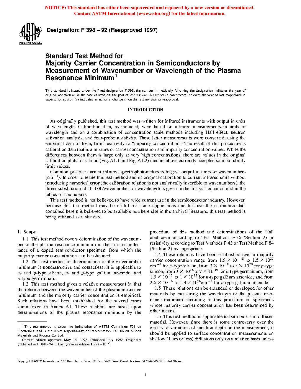 1.3 This test method gives a relative measurement in that the relation between the wavenumber of the plasma resonance minimum and the majority carrier concentration is empirical. Such relations have been established for the several cases summarized in Annex A1. These relations are based upon determinations of the plasma resonance minimum by the procedure of this method and determinations of the Hall coefficient according to Test Methods