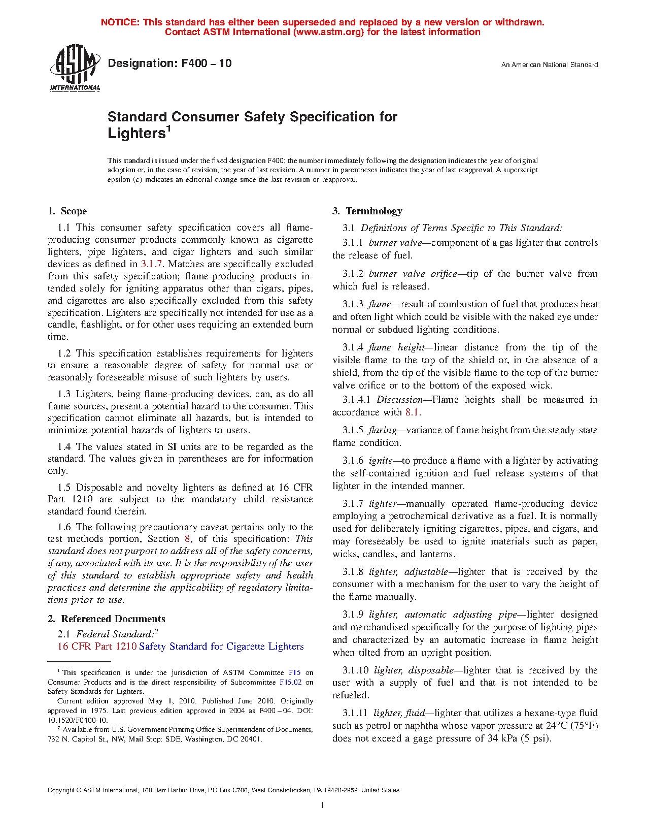 1.1 This consumer safety specification covers all flame-producing consumer products commonly known as cigarette lighters, pipe lighters, and cigar lighters and such similar devices as defined in 3.1.9. Matches are specifically excluded from this safety specification; flame-producing products intended solely for igniting apparatus other than cigars, pipes, and cigarettes, including products covered by Specification F2201, are also specifically excluded from this safety specification. Lighters are specifically not intended for use as a candle, flashlight, or for other uses requiring an extended burn time.