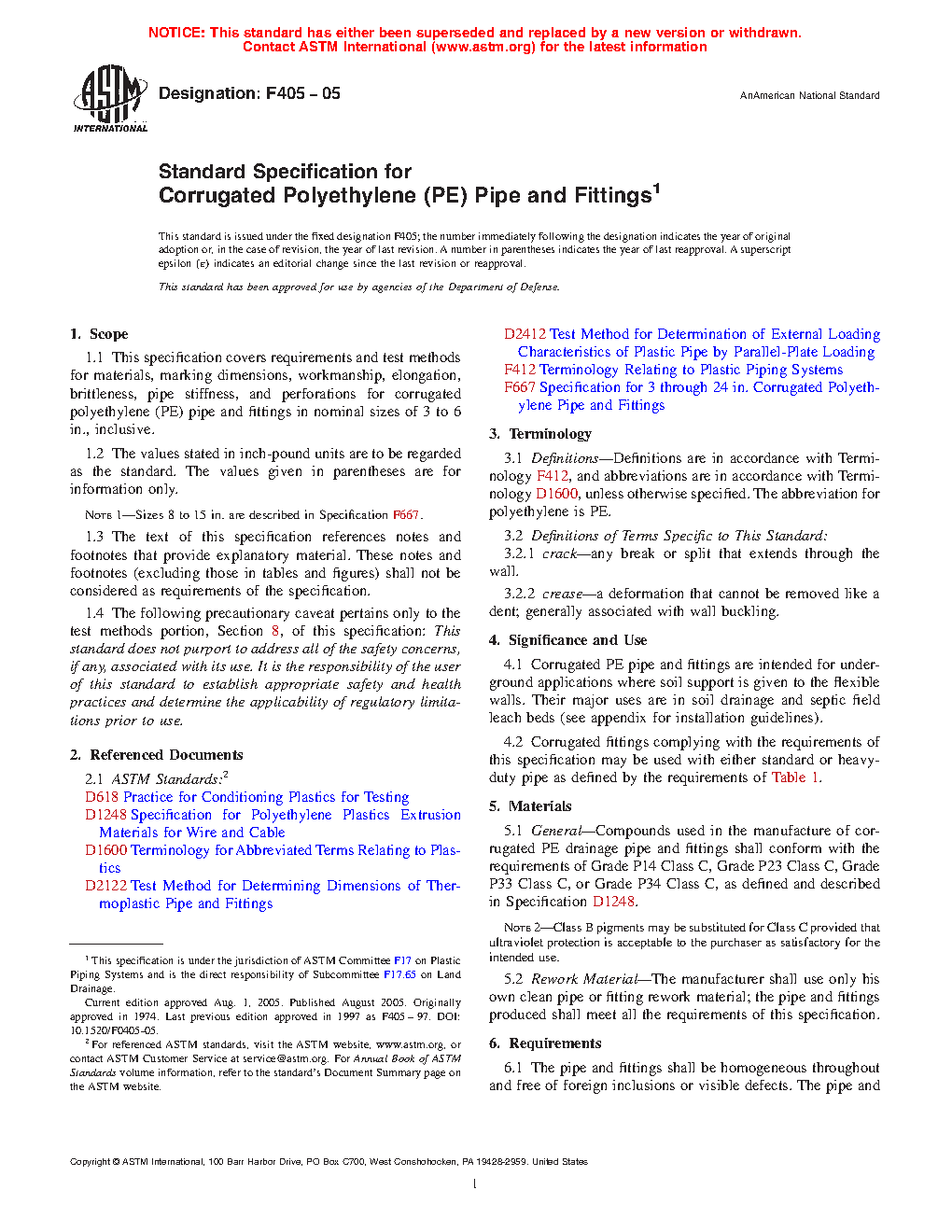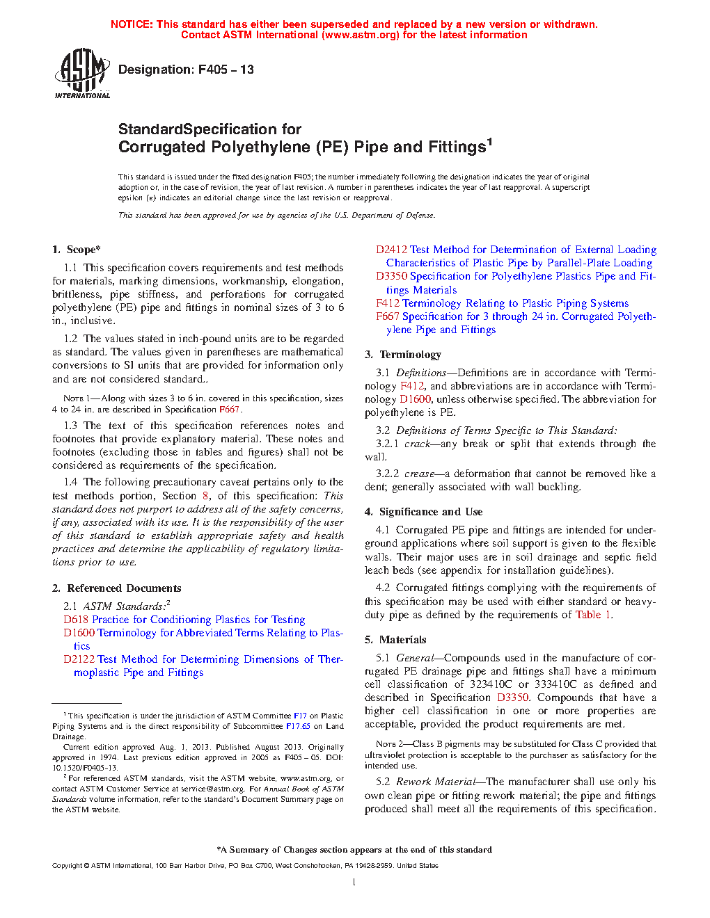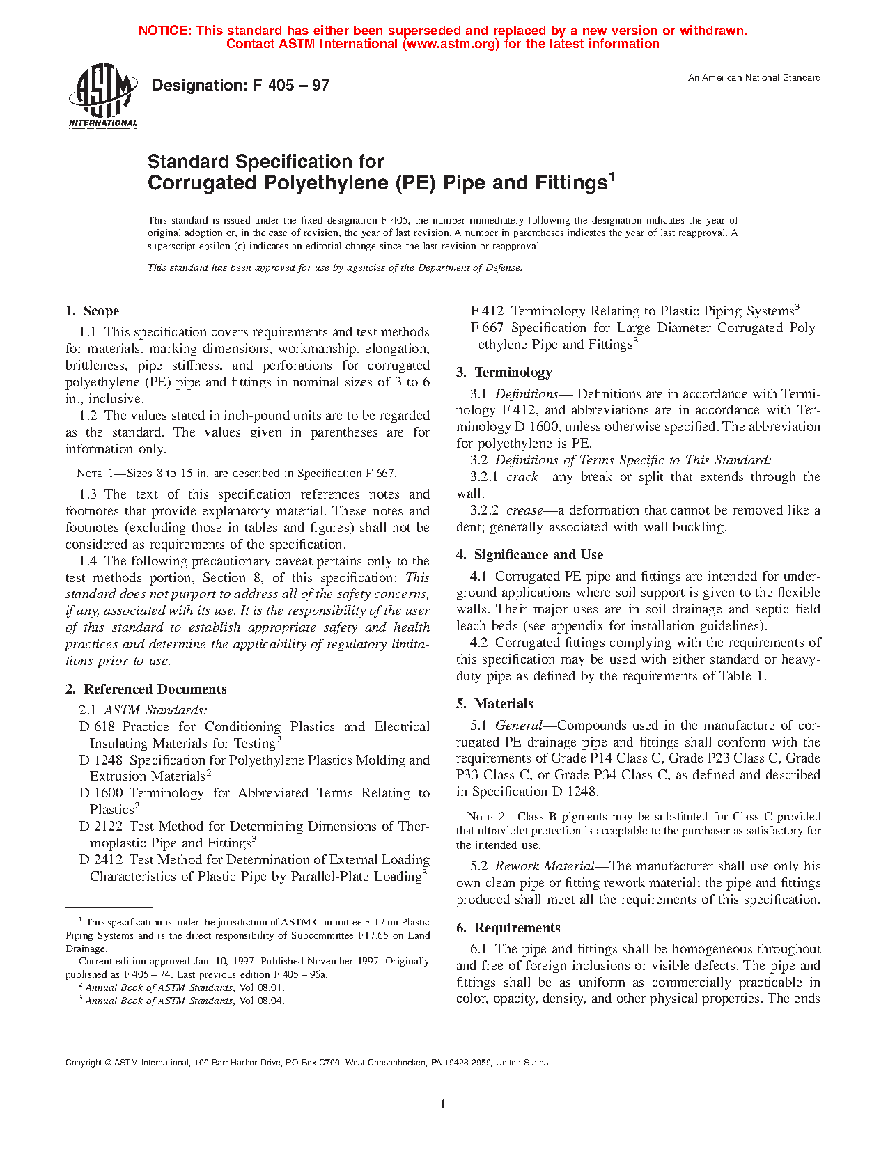 This specification covers the physical and dimensional requirements and associated test methods for corrugated polyethylene (PE) pipe and fittings intended for underground applications, particularly in soil drainage and septic field leach beds, where soil support is given to the flexible walls. Pipe and fittings shall adhere to physical test requirements such as elongation, brittleness, pipe stiffness, and perforations.