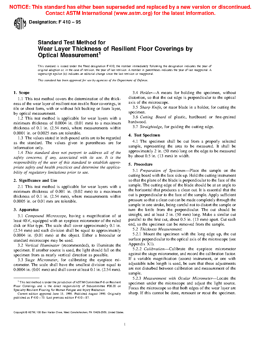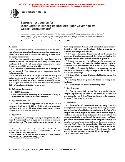 1.2 This test method is applicable for wear layers with a minimum thickness of 0.0004 in. (0.01 mm) to a maximum thickness of 0.1 in. (2.54 mm), where measurements within 0.0001 in. or 0.0025 mm are tolerable.