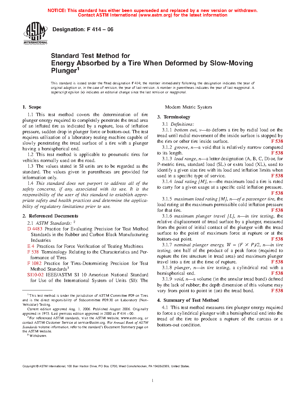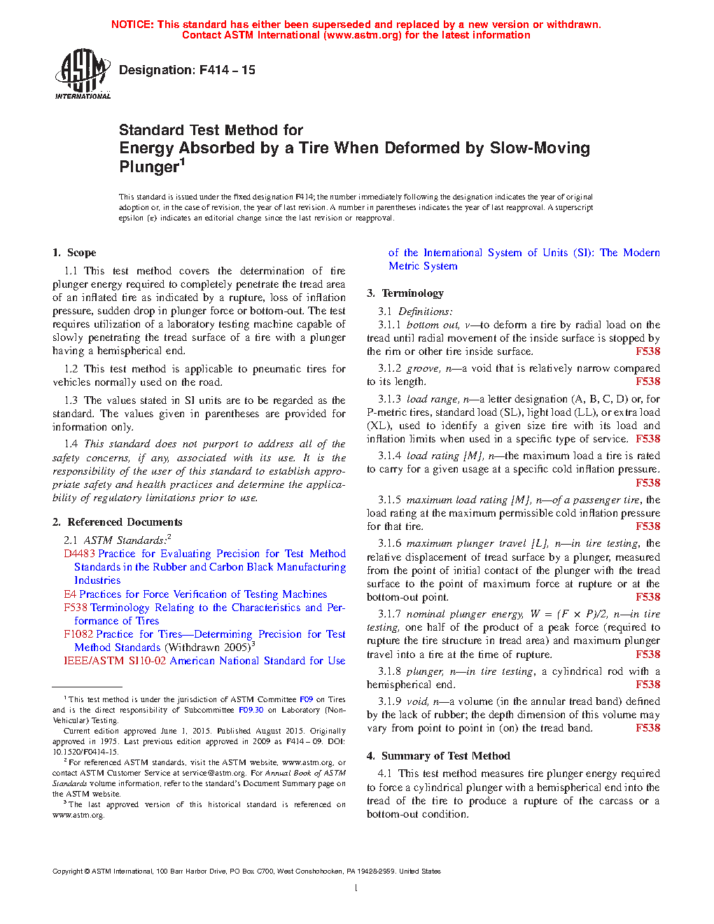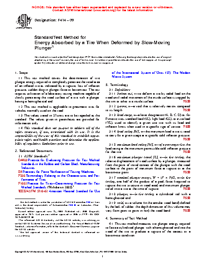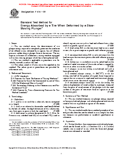1.1 This test method covers the determination of tire plunger energy required to completely penetrate the tread area of an inflated tire as indicated by a rupture, loss of inflation pressure, sudden drop in plunger force or bottom-out. The test requires utilization of a laboratory testing machine capable of slowly penetrating the tread surface of a tire with a plunger having a hemispherical end.