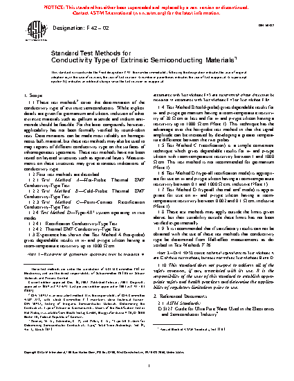 1.1 These test methods cover the determination of the conductivity type of extrinsic semiconductors. While explicit details are given for germanium and silicon, inclusion of other extrinsic materials such as gallium arsenide and indium antimonide should be feasible. For the latter compounds, however, applicability has not been formally verified by round-robin tests. Determinations can be made most reliably on homogeneous bulk material, but these test methods may also be used to map regions of different conductivity type on the surfaces of inhomogeneous specimens. These test methods have not been tested on layered structures such as epitaxial layers. Measurements on these structures may give erroneous indications of conductivity type.