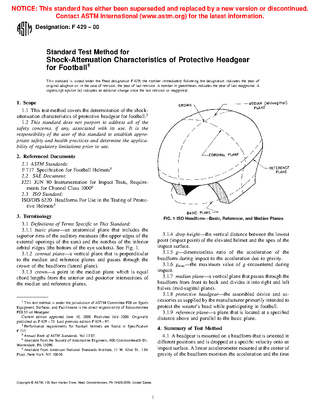 1.1 This test method covers the determination of the shock-attenuation characteristics of protective headgear for football.