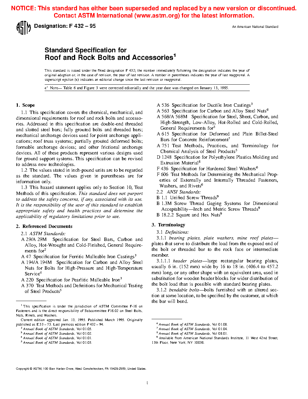 This specification covers the chemical, mechanical, and dimensional requirements for roof and rock bolts and accessories. Addressed in this specification are double-end threaded and slotted steel bars; fully grouted bolts and threaded bars; mechanical anchorage devices used for point anchorage applications; roof truss systems; partially grouted deformed bolts; formable anchorage devices; and other frictional anchorage devices. All of these products represent various designs used for ground support systems. Threads on bolts or threaded bars may be cold rolled or machine cut on the hot-rolled bars. Bearing and header plates may be strengthened by cold forming or may be hardened by quenching in a liquid medium from above the austenitizing temperature and tempering. Hardened steel washers shall be through hardened by quenching in a liquid medium from above the austenitizing temperature and tempering. Test shall be performed in accordance with the following test methods: tensile strength; elongation; test for bearing and header plates; test for notched bendable bolts; and tests of roof truss components.