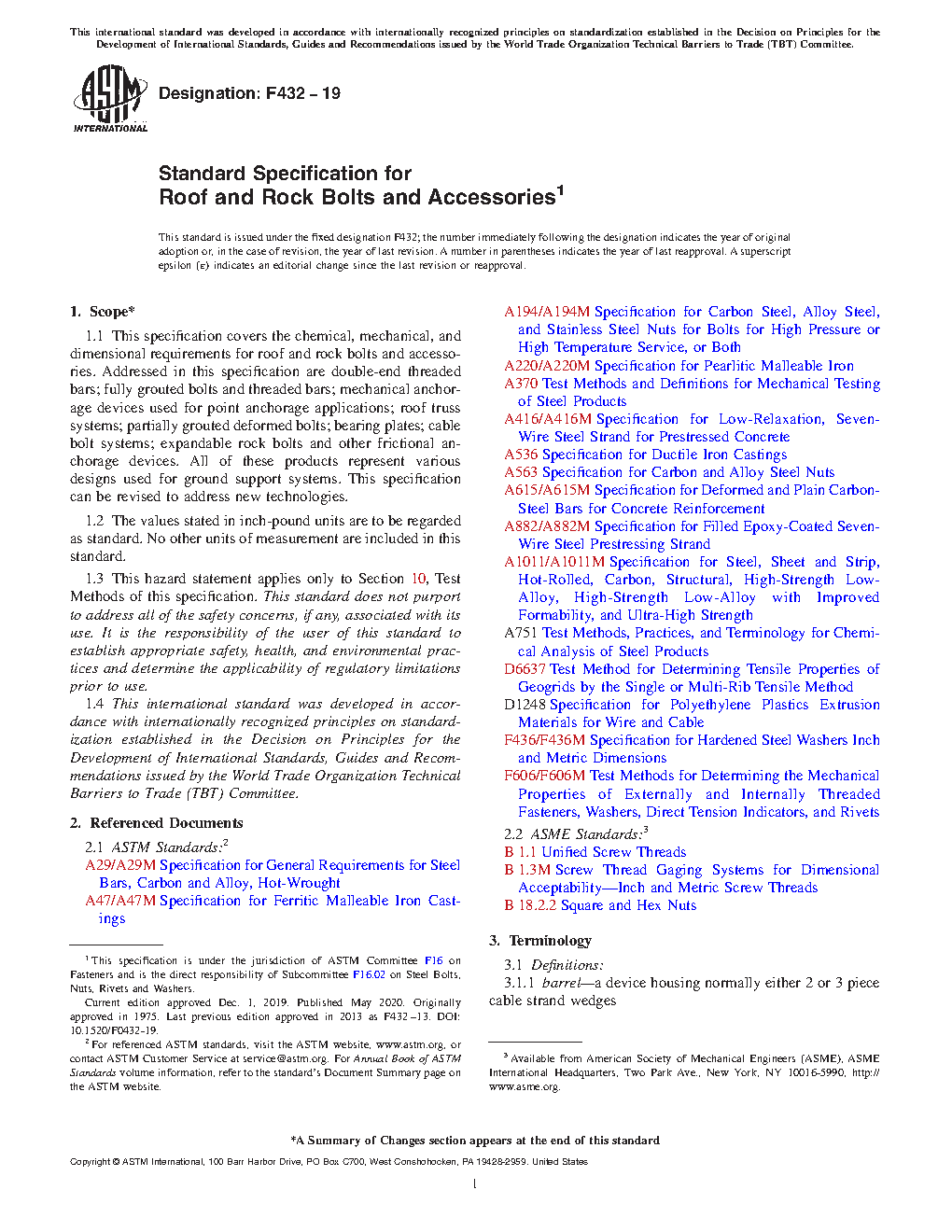 1.1 This specification covers the chemical, mechanical, and dimensional requirements for roof and rock bolts and accessories. Addressed in this specification are double-end threaded bars; fully grouted bolts and threaded bars; mechanical anchorage devices used for point anchorage applications; roof truss systems; partially grouted deformed bolts; bearing plates; cable bolt systems; expandable rock bolts and other frictional anchorage devices. All of these products represent various designs used for ground support systems. This specification can be revised to address new technologies.