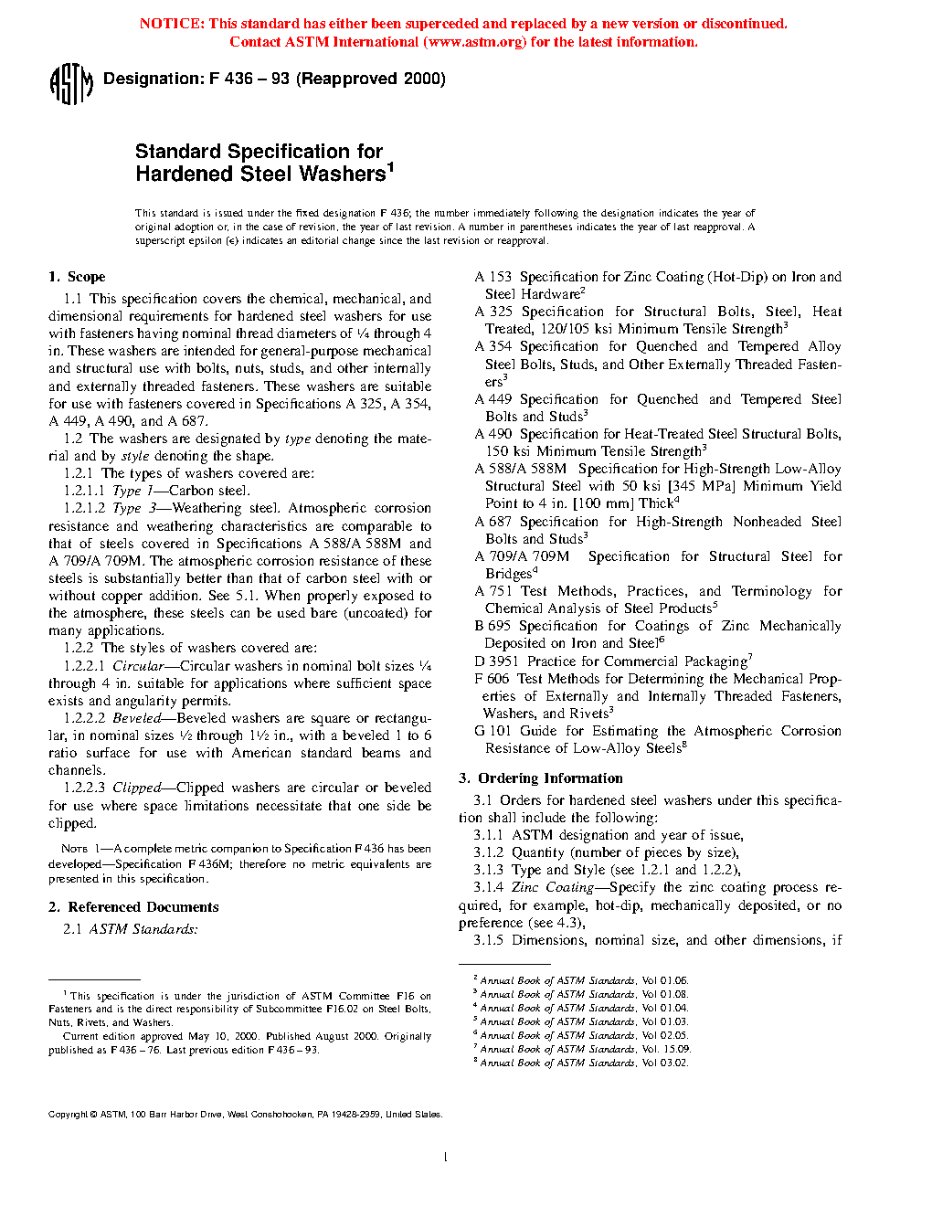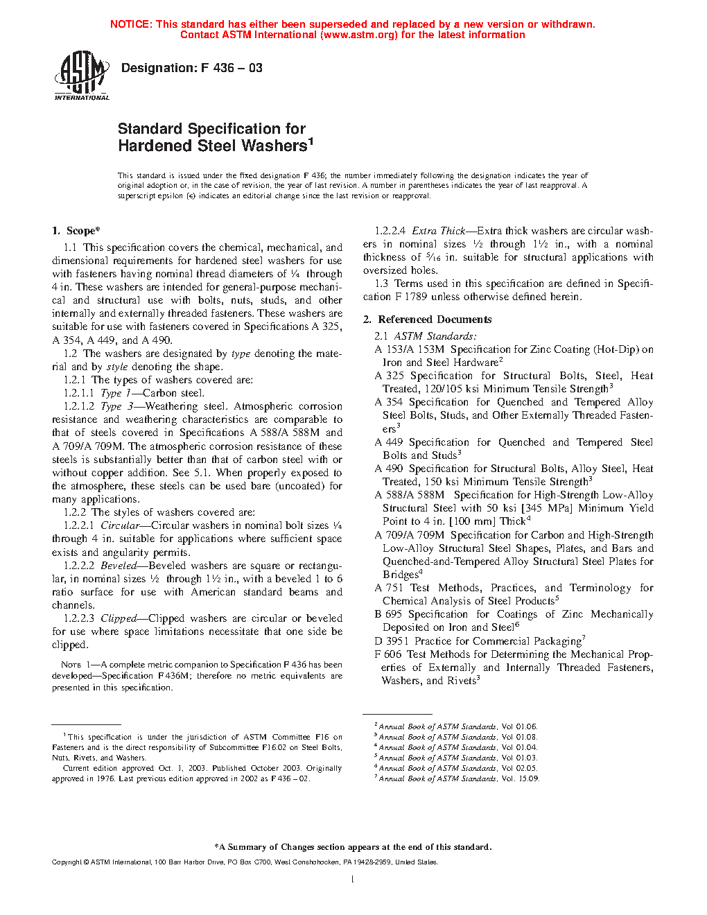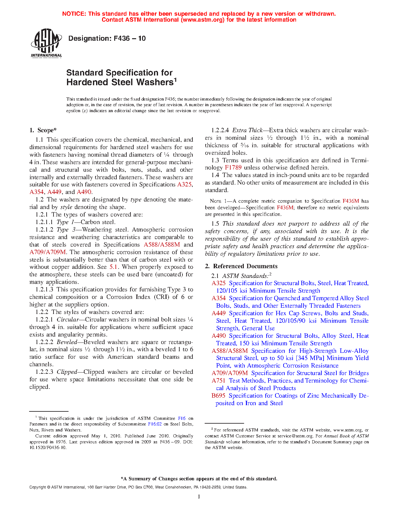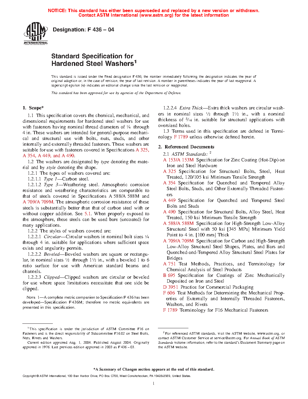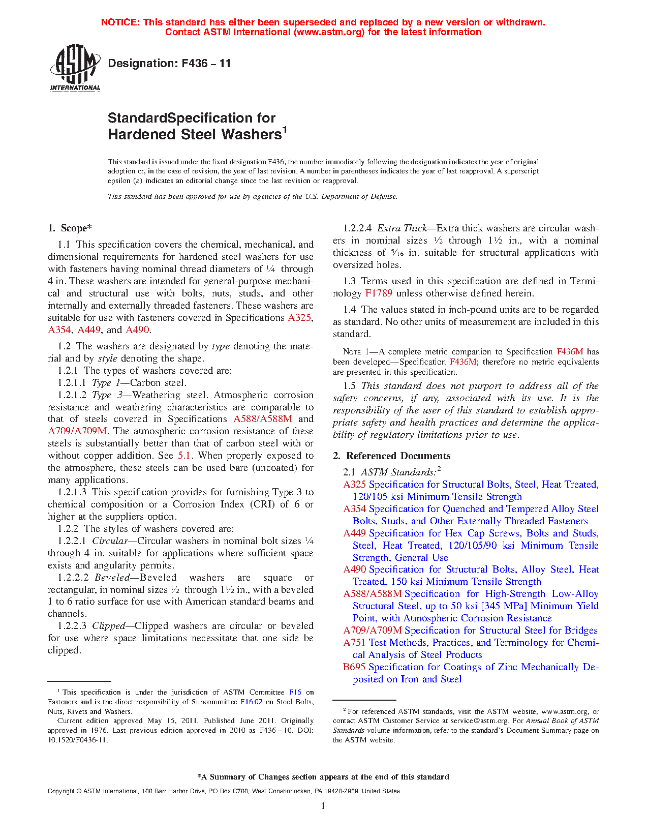 1.1 This specification covers the chemical, mechanical, and dimensional requirements for hardened steel washers for use with fasteners having nominal thread diameters of 1/4 through 4 in. These washers are intended for general-purpose mechanical and structural use with bolts, nuts, studs, and other internally and externally threaded fasteners. These washers are suitable for use with fasteners covered in Specifications A 325, A 354, A 449, A 490, and A 687.