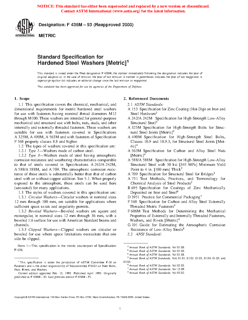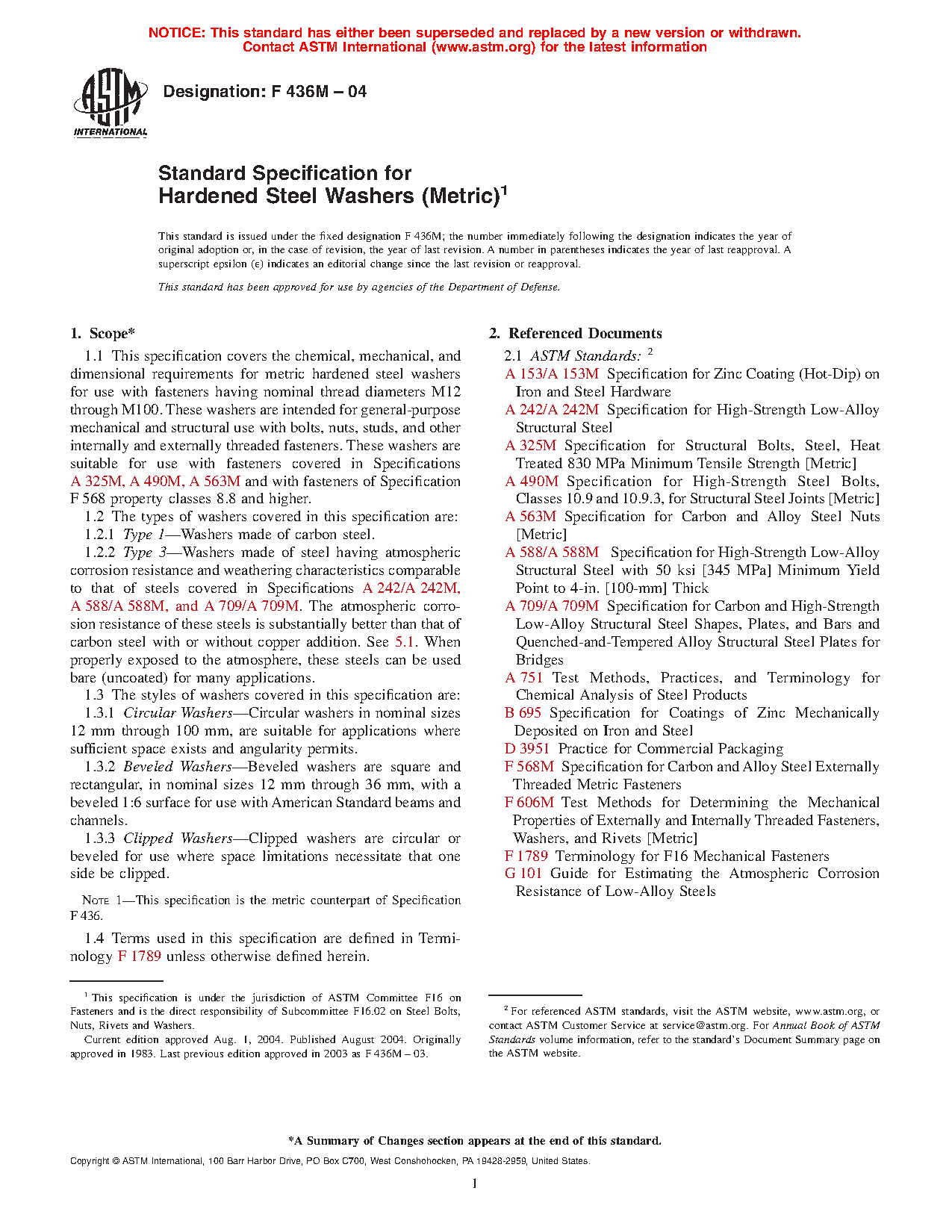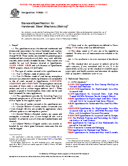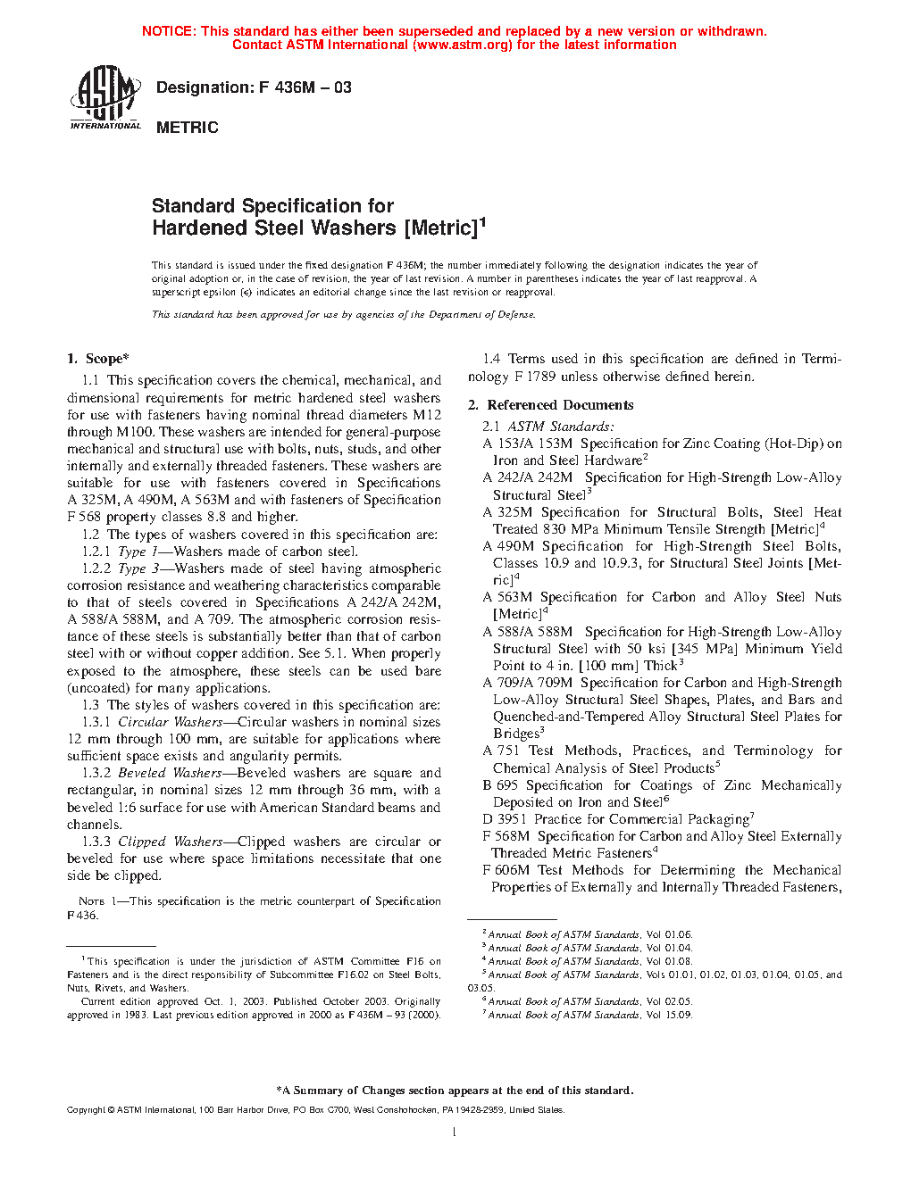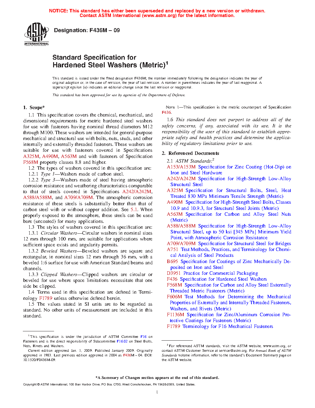 1.1 This specification covers the chemical, mechanical, and dimensional requirements for metric hardened steel washers for use with fasteners having nominal thread diameters M12 through M100. These washers are intended for general-purpose mechanical and structural use with bolts, nuts, studs, and other internally and externally threaded fasteners. These washers are suitable for use with fasteners covered in Specifications A325M, A490M, A563Mand with fasteners of Specification F568M property classes 8.8 and higher.