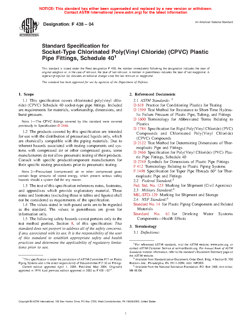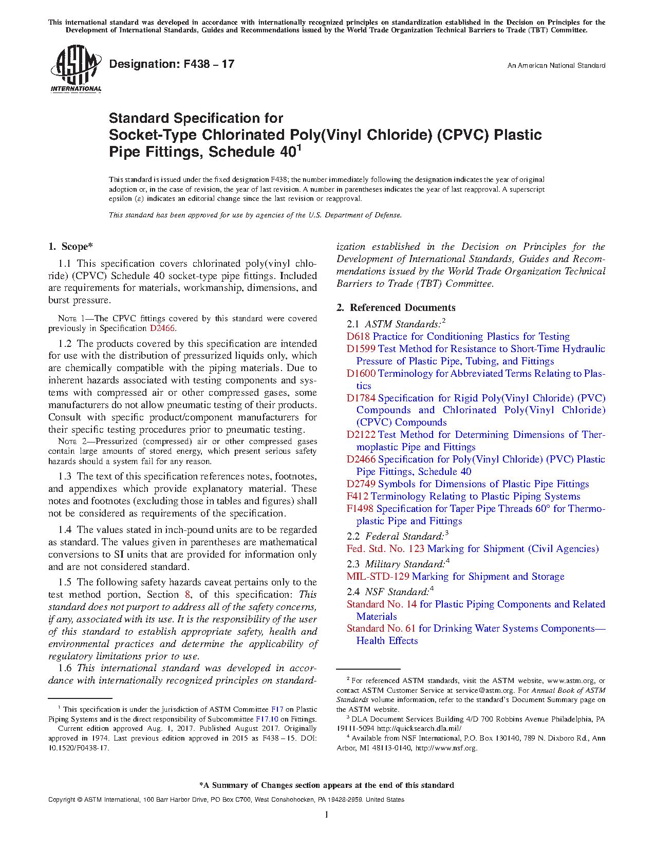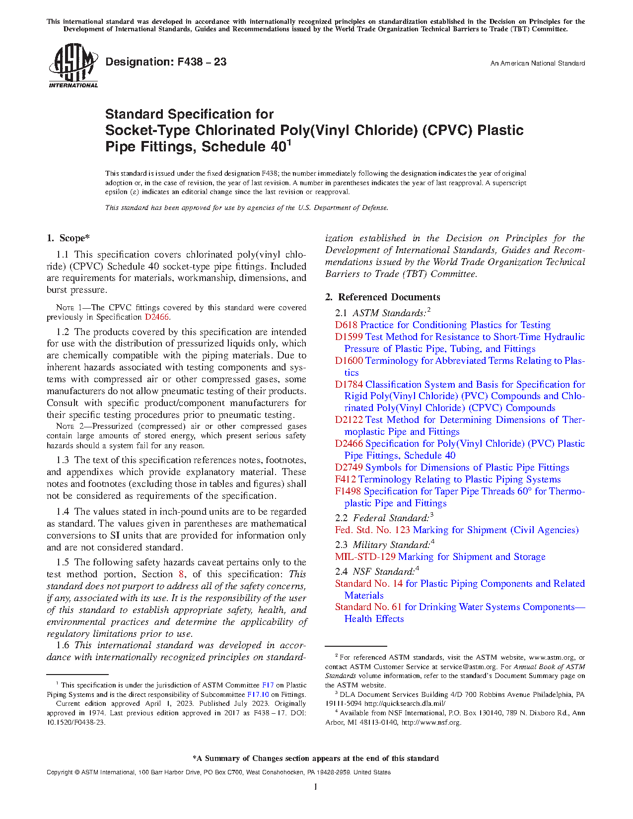 Note 1: The CPVC fittings covered by this standard were covered previously in Specification D2466.