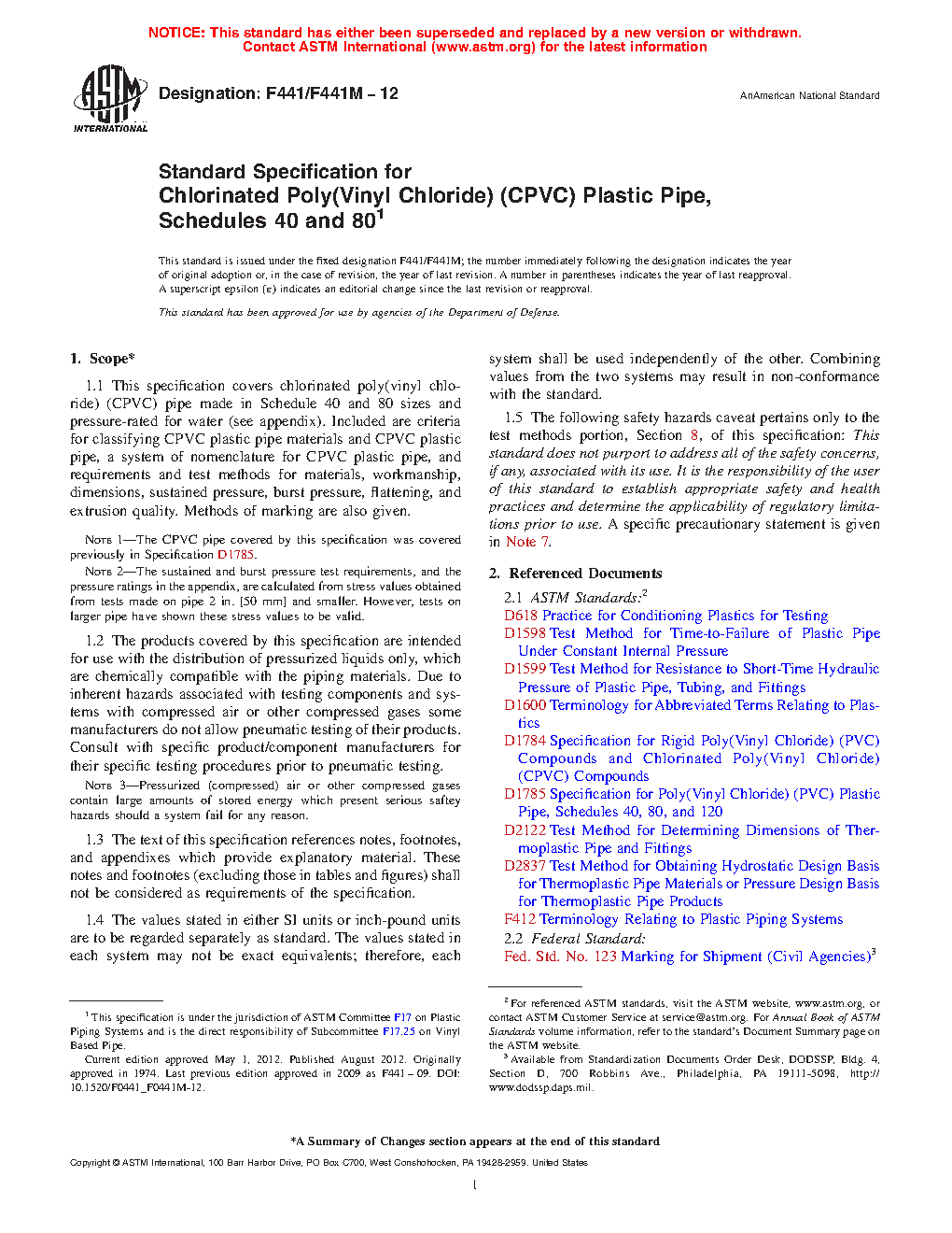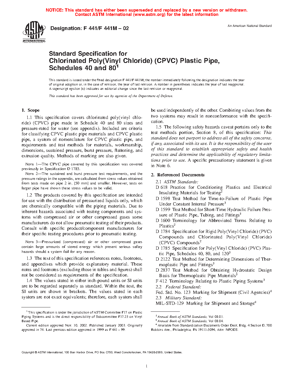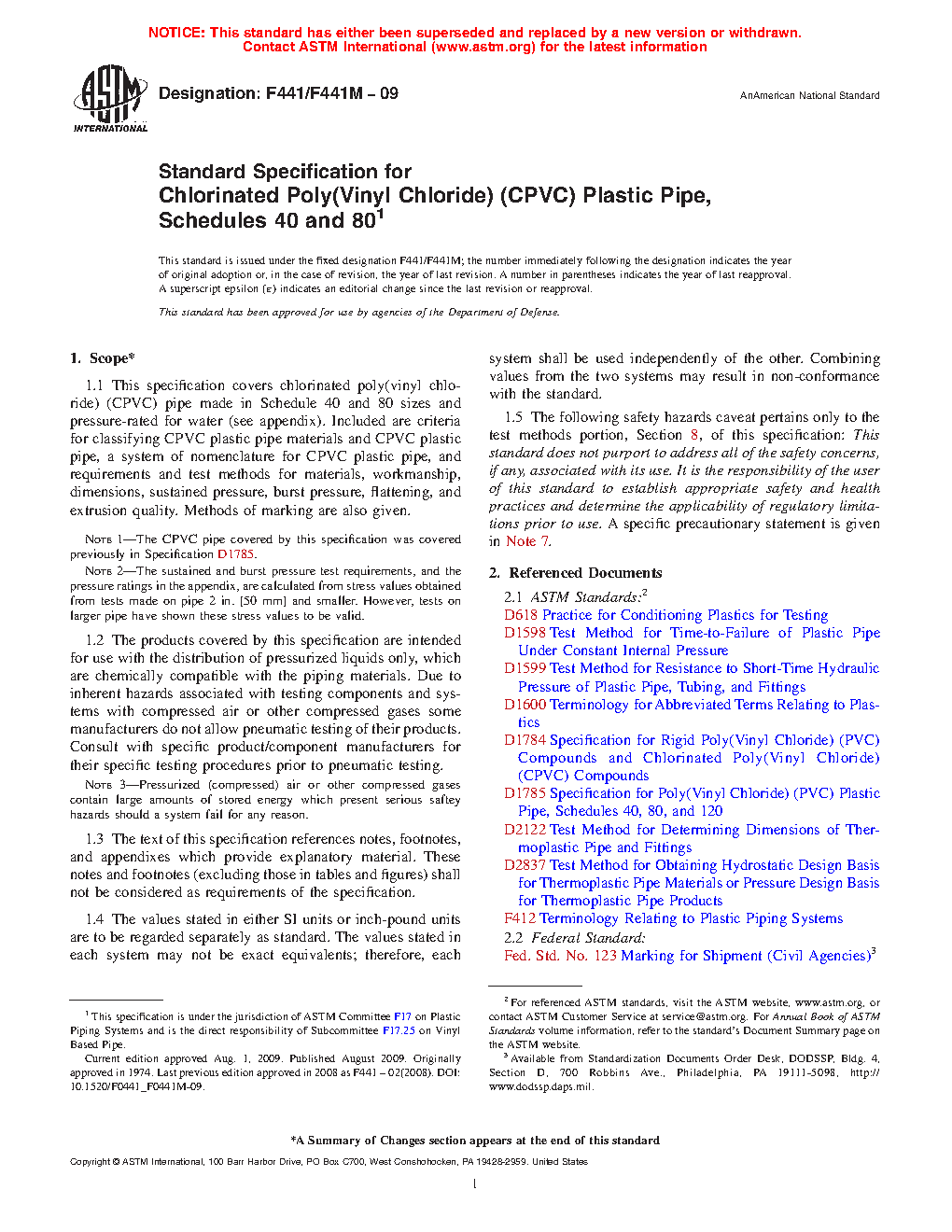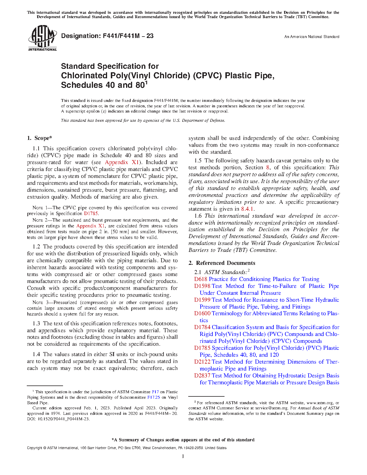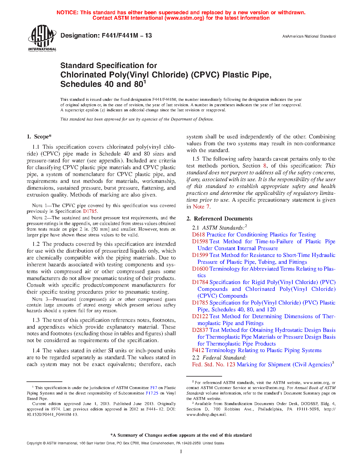 This specification covers chlorinated poly(vinyl chloride) (CPVC) pipes made in Schedule 40 and 80 sizes and pressure-rated for water. These pipes are intended for use with the distribution of pressurized liquids only, which are chemically compatible with the piping materials. Included here are the criteria for classifying CPVC plastic pipe materials and CPVC plastic pipes, a system of nomenclature for CPVC plastic pipes, and requirements and test methods for materials, workmanship, dimensions, sustained pressure, burst pressure, accelerated regression, flattening resistance, and extrusion quality.