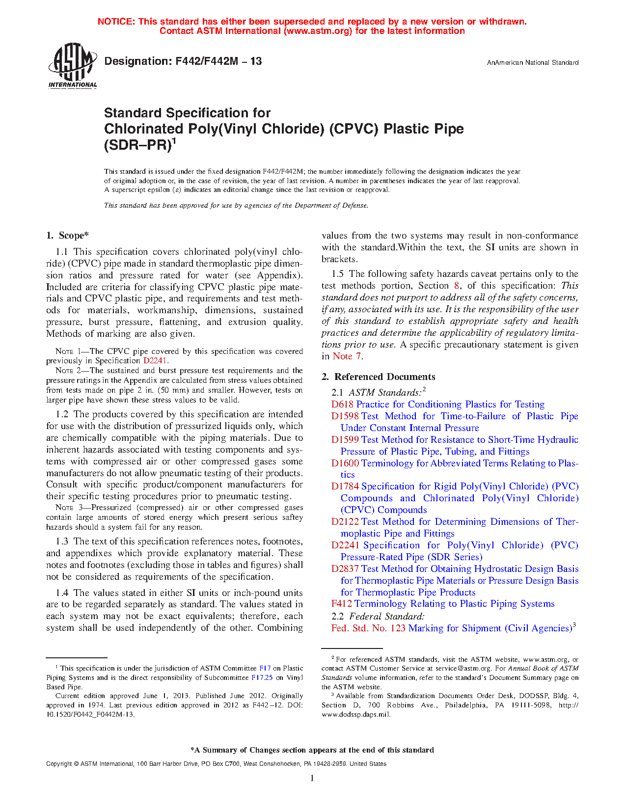 Note 1: The CPVC pipe covered by this specification was covered previously in Specification D2241.