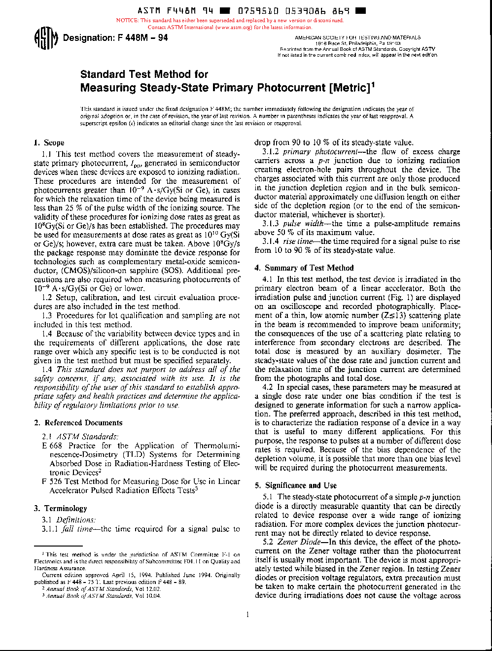 1.1 This test method covers the measurement of steady-state primary photocurrent, pp , generated in semiconductor devices when these devices are exposed to ionizing radiation. These procedures are intended for the measurement of photocurrents greater than 10 -9 A[dot]s/Gy(Si or Ge), in cases for which the relaxation time of the device being measured is less than 25% of the pulse width of the ionizing source. The validity of these procedures for ionizing dose rates as great as 10 Gy(Si or Ge)/s has been established. The procedures may be used for measurements at dose rates as great as 10 10 Gy(Si or Ge)/s; however, extra care must be taken. Above 10 Gy/s the package response may dominate the device response for technologies such as complementary metal-oxide semiconductor, (CMOS)/silicon-on sapphire (SOS). Additional precautions are also required when measuring photocurrents of 10 -9 A[dot]s/Gy(Si or Ge) or lower.