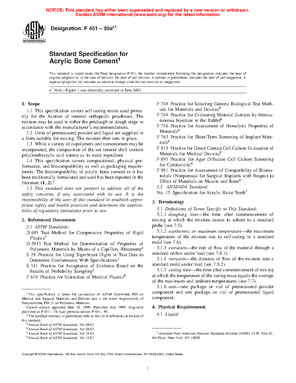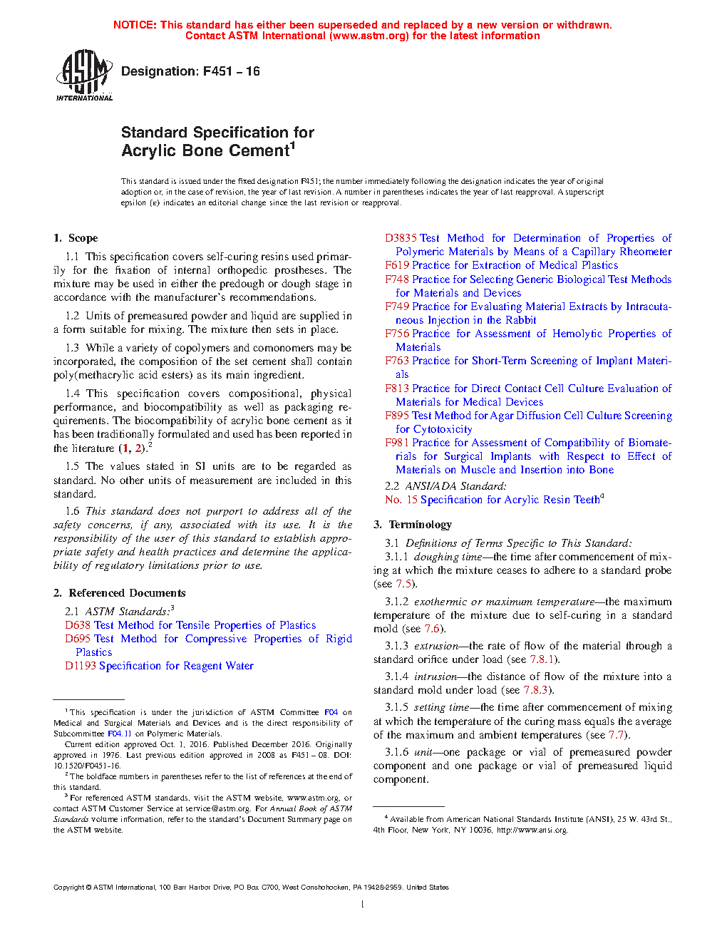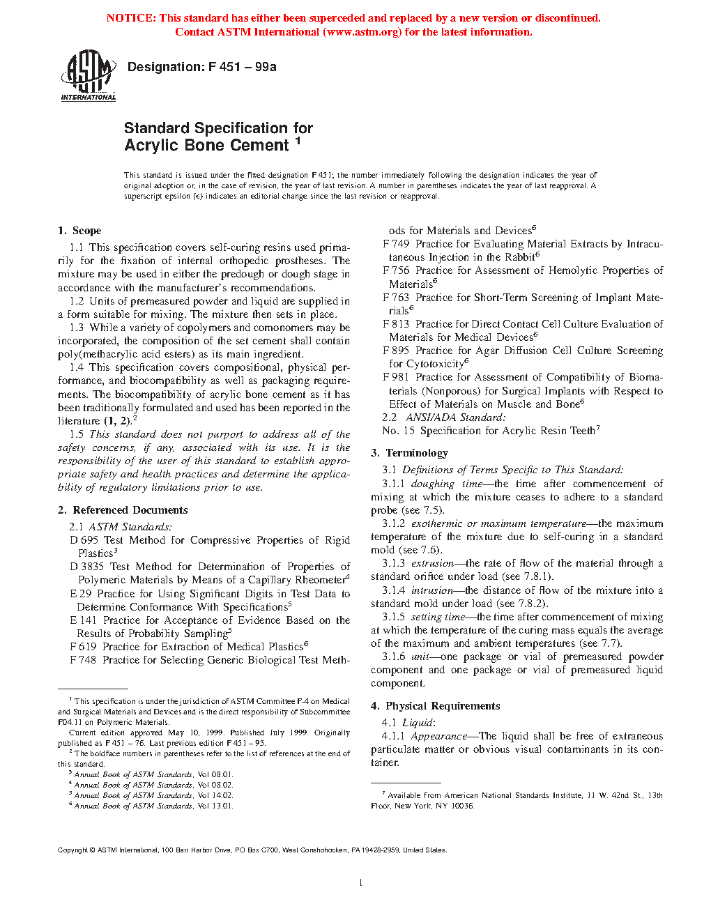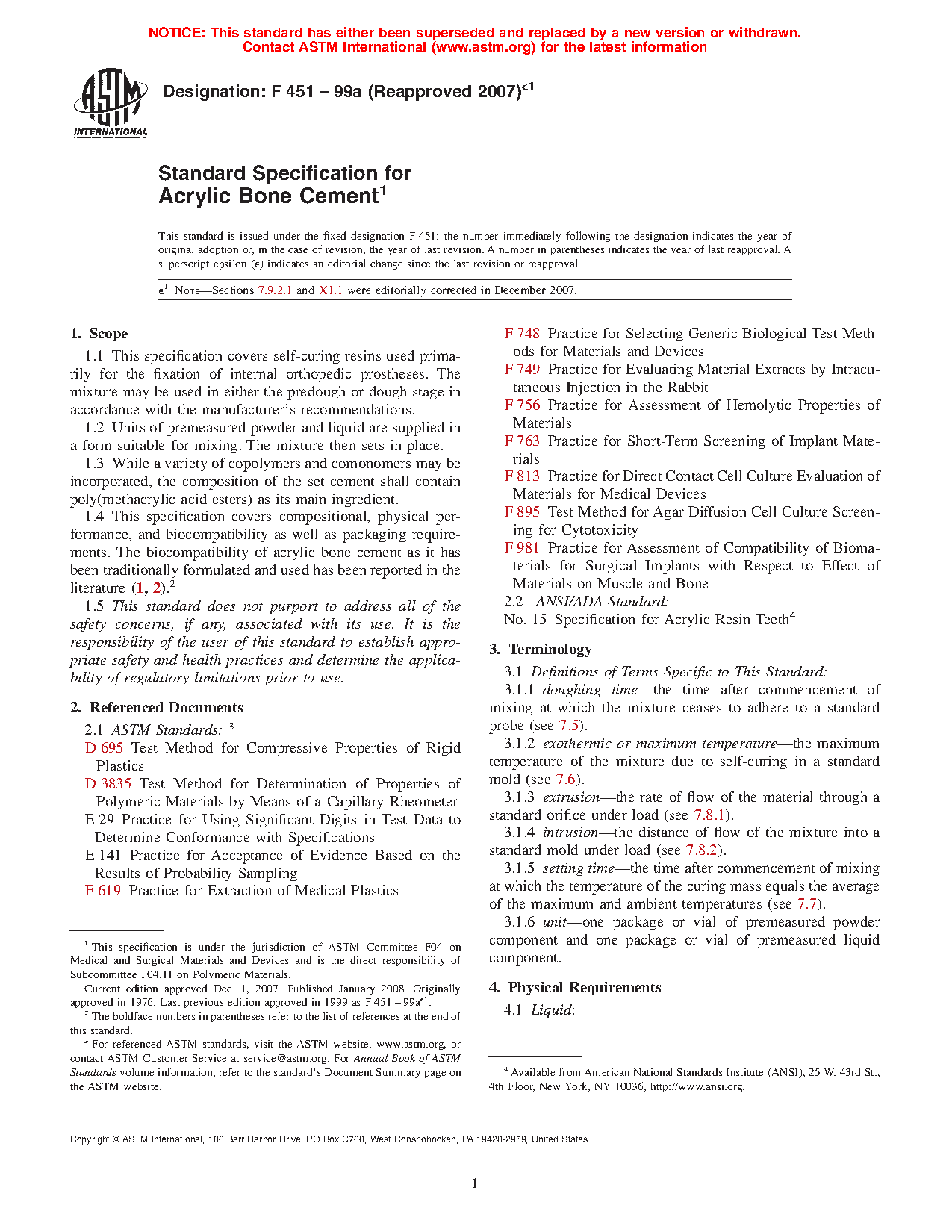 1.4 This specification covers compositional, physical performance, and biocompatibility as well as packaging requirements. The biocompatibility of acrylic bone cement as it has been traditionally formulated and used has been reported in the literature (1, 2).2