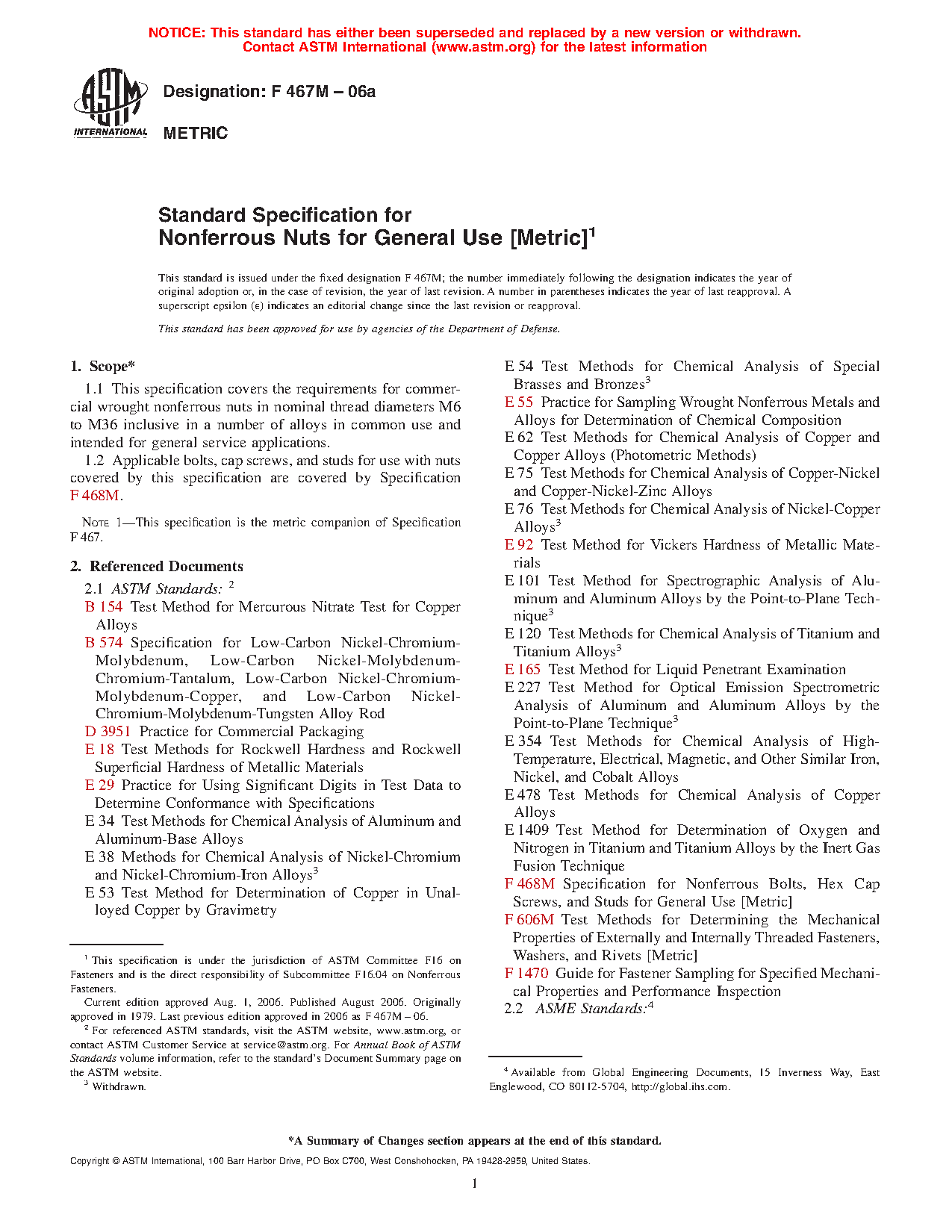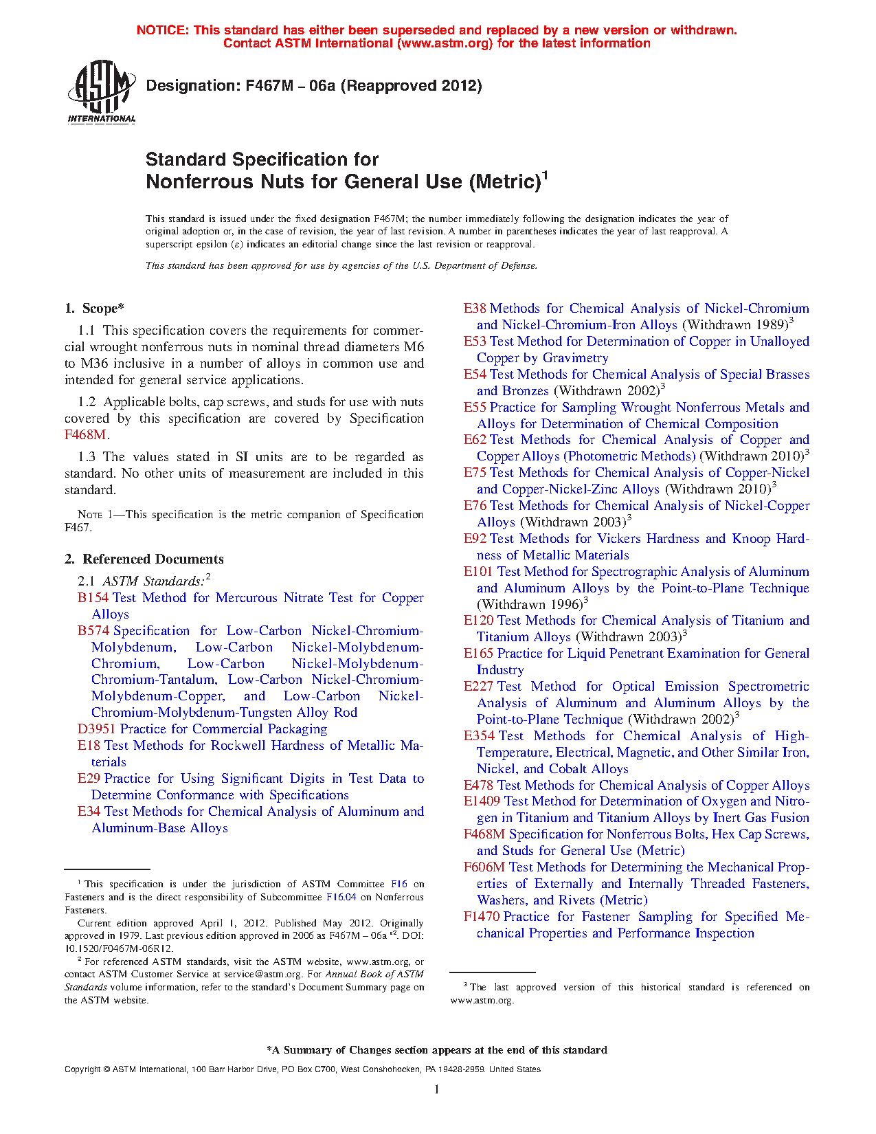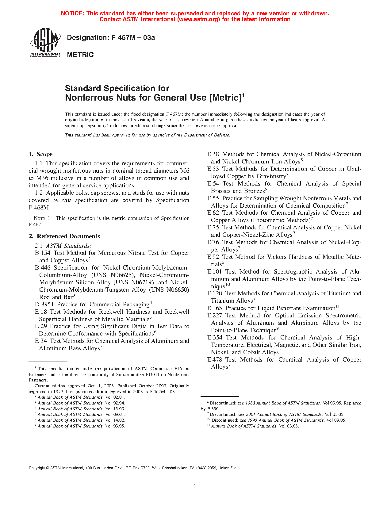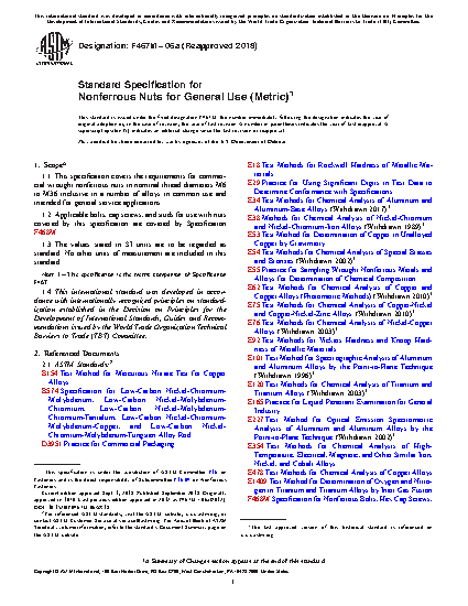 1.1 This specification covers the requirements for commercial wrought nonferrous nuts in nominal thread diameters M6 to M36 inclusive in a number of alloys in common use and intended for general service applications.
