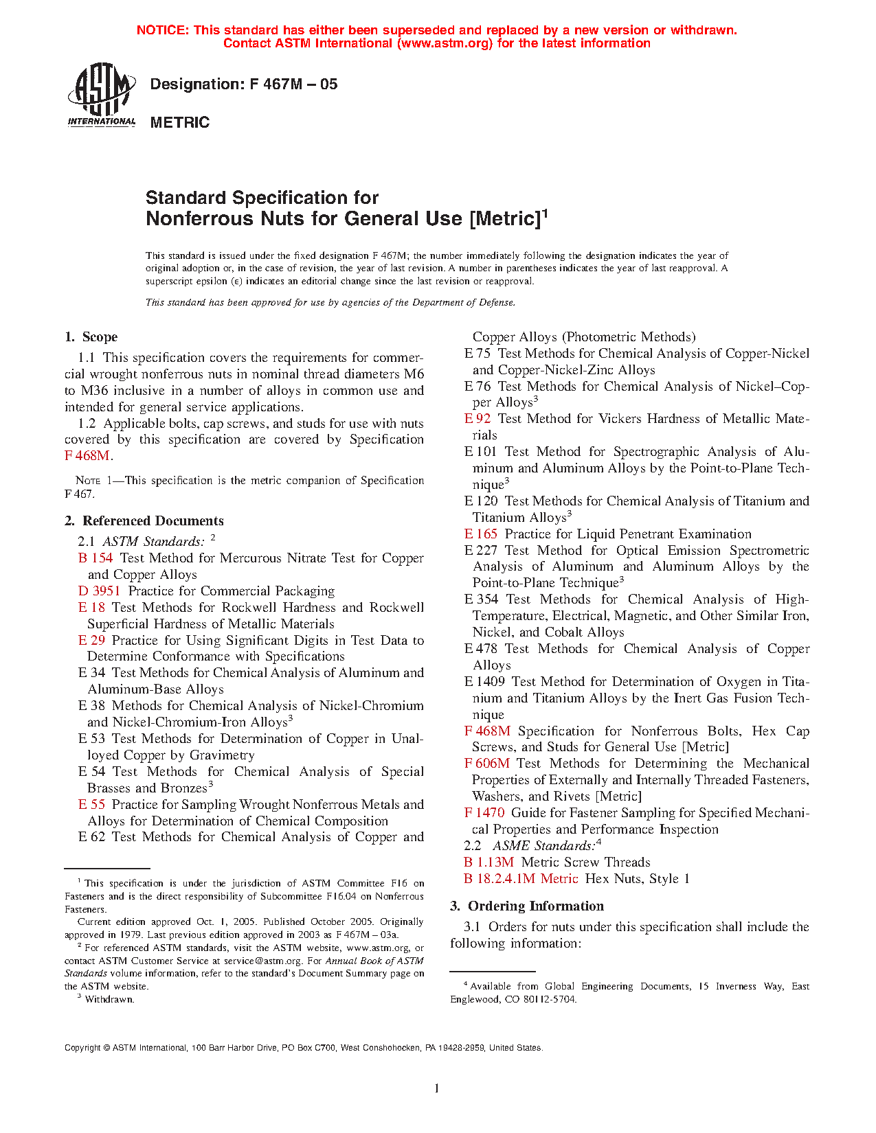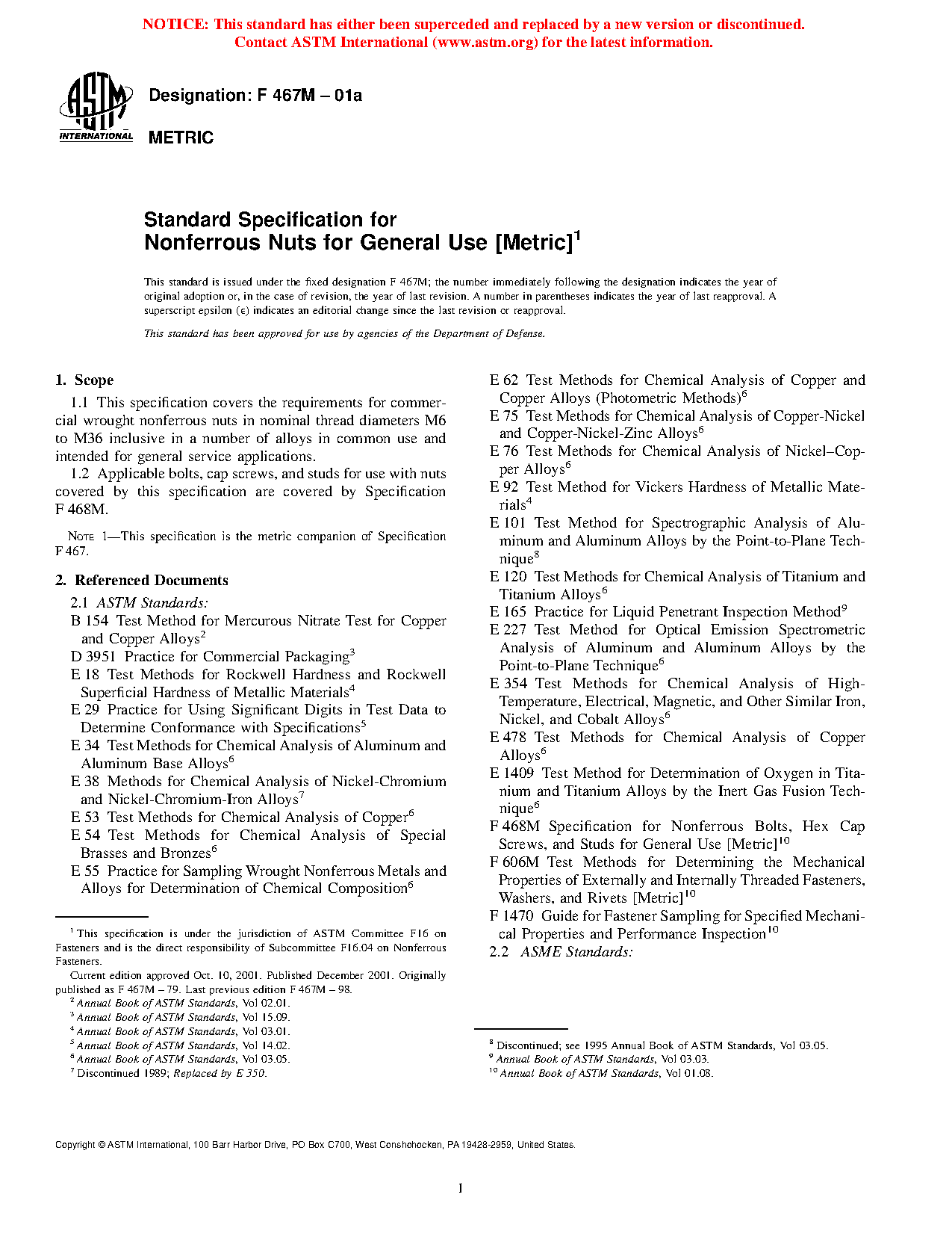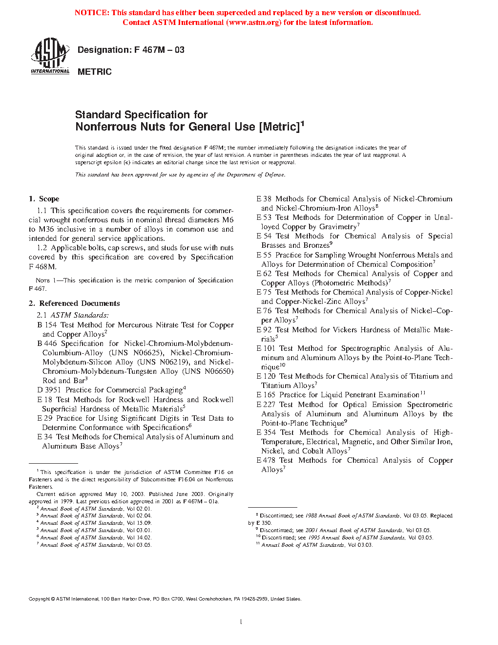 1.1 This specification covers the requirements for commercial wrought nonferrous nuts in nominal thread diameters M6 to M36 inclusive in a number of alloys in common use and intended for general service applications.