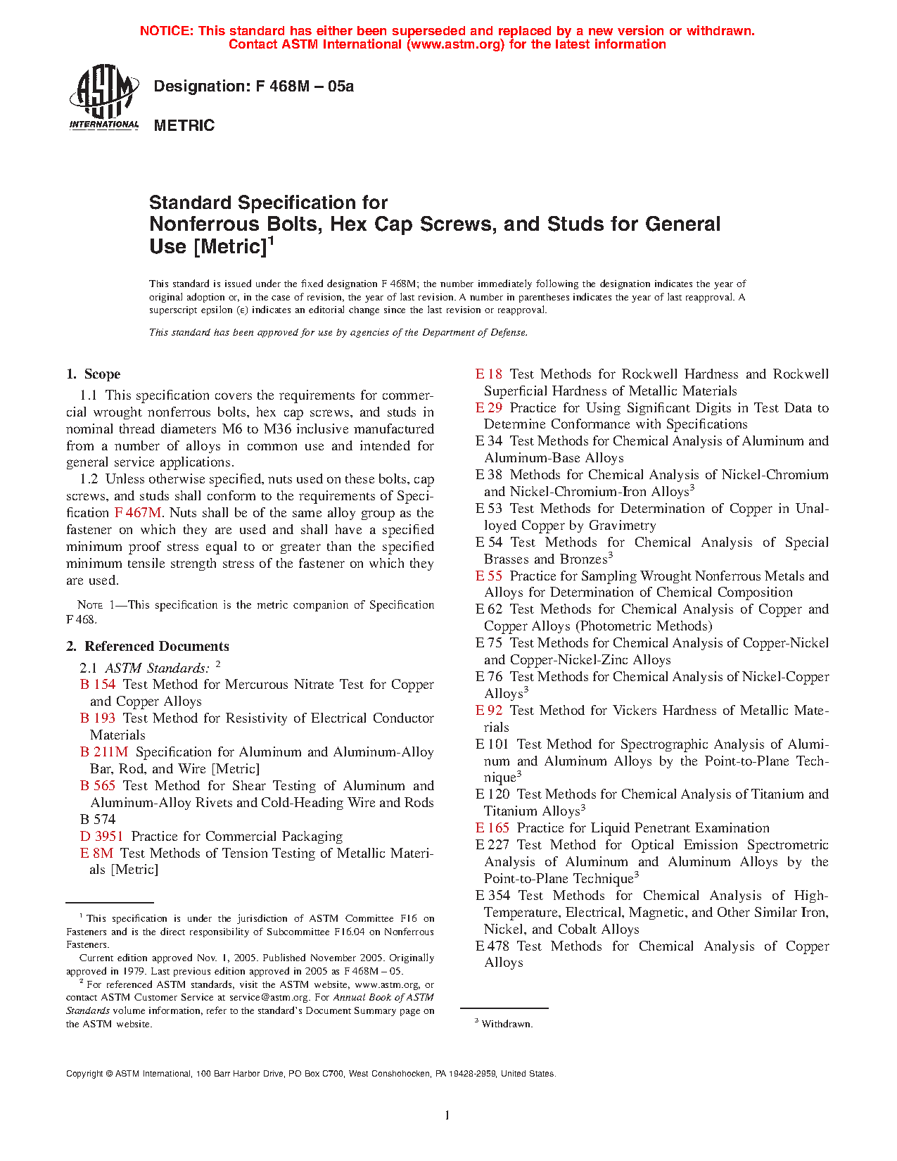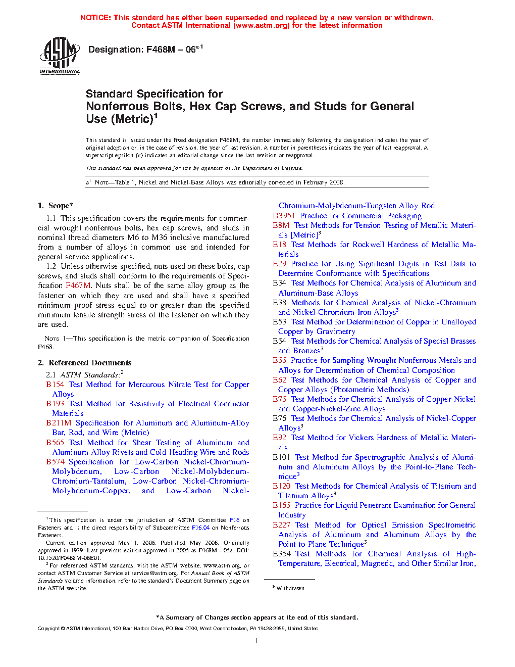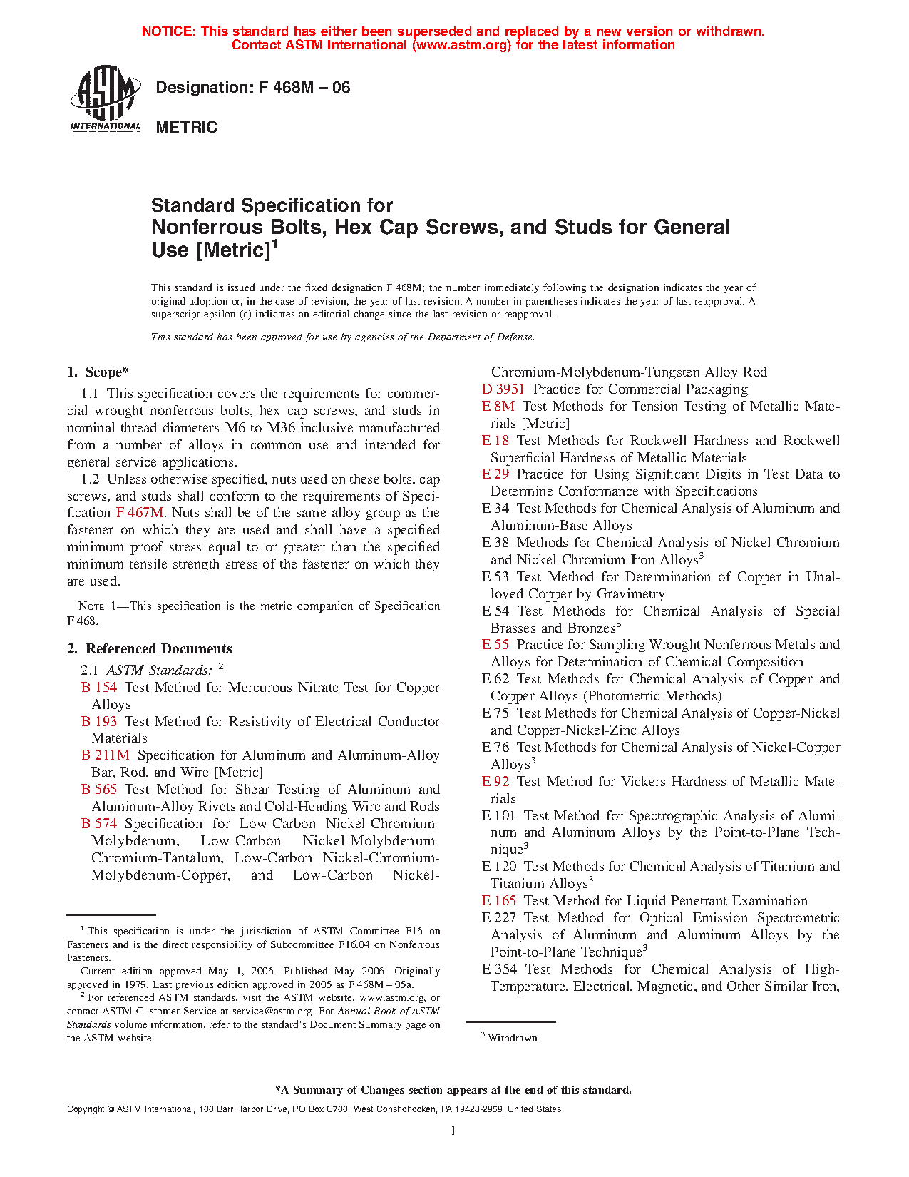 1.1 This specification covers the requirements for commercial wrought nonferrous bolts, hex cap screws, and studs in nominal thread diameters M6 to M36 inclusive manufactured from a number of alloys in common use and intended for general service applications.